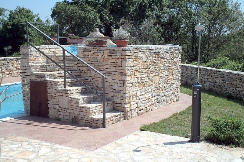 ISZTRIA, JURŠIĆI - Családi kővilla csendes helyen található, csodálatos kilátással az Isztriai-félsziget zöldjére és dombos tájára. Csupán 15 percnyi autóútra a tengertől és az első strandoktól, csodálatos helyen, érintetlen természettel körülvéve, 600 m-es telken épült fel ez a 240 m2 összterületű gyönyörű ház. A földszinten található egy konyha étkezővel és egy nappali, valamint egy hálószoba fürdőszobával és külön WC-vel. A nappaliban van egy nagy erkélyajtó, kilátással és kijárattal a medencére és egy fedett teraszra grillezővel.