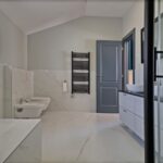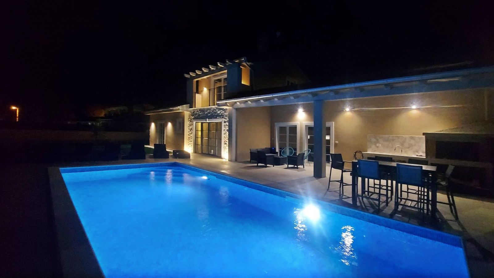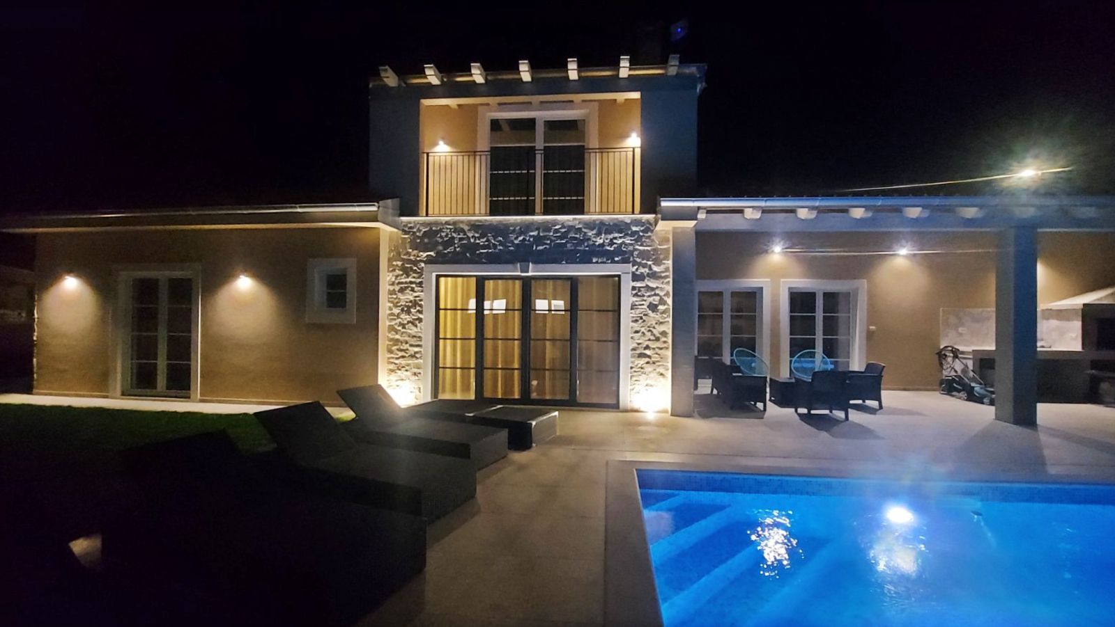 Kanfanarban megtalálja azt a békét, amely az isztriai hátország kis falvaira jellemző, bár minden kéznél van. Egy kis hely, ahol az enyhe mediterrán éghajlat és a belső Isztria természeti adottságai ötvöződnek, 15 percnyi autóútra Rovinjtól. Kanfanar települése számos látnivalóról híres. A Lim-csatorna gyönyörű zöld-kék oázisától a középkori Dvigrad város romjaiig, számos régészeti lelőhelyig, gazdag szakrális örökségig, helyi termékekig. A kis tengeri kijárattal Kanfanar település érdekes célpont a természet, a történelmi örökség, az isztriai hagyományok és kultúra, valamint az aktív pihenés szerelmeseinek. Kanfanar városától nem messze egy tágas ház medencével eladó. Az időtlen építészetű ház csendes környéken található családi házak és nyaralók között. Harmonizált vonzó külső és hasonlóan harmonizált modern belső terek, harmonikus tervezésű helyiségek azt mutatják, hogy ennek az ingatlannak az elrendezése során minden részletre gondoltak. A földszinten egy nyitott koncepciójú nappali található, amely egyesíti a német Moderano gyártó egyedi konyháját, egy étkezőt és egy nappalit, ahonnan egy fedett veranda nyílik, nyári konyhával és étkezővel. A földszint többi részén két hálószoba saját fürdőszobával, egy technikai helyiség/tároló helyiség és egy wc található. A földszint alaprajzát egy külön bejáratú garzonlakás egészíti ki. Tölgyfából készült belső lépcső vezet az emeletre, ahol egy hálószoba, egy tágas fürdőszoba és egy fedett terasz található. A ház udvara teljesen bekerített, kertészetileg rendezett. Egy 32 m²-es fűtött medence uralja napozóterasszal. Az ingatlan kivitelezésének és berendezésének minősége elismert például 10 cm-es falak szigetelésében, demit homlokzat, szellőző tető 25 cm-es kőgyapottal, ablakok háromrétegű üveggel – üveg 4 évszakos, betörő- szigetelő ajtók, padlófűtés, szanitervíz és úszómedence fűtése hőszivattyúkkal, minden külső felület vízszigetelése, valamint esőztető és csepegtető öntözőrendszer. Elhelyezkedése, felépítése és kényelme ideális lehetőséget nyújt a nyugodt családi életre, valamint befektetésnek turisztikai bérbeadás céljából.