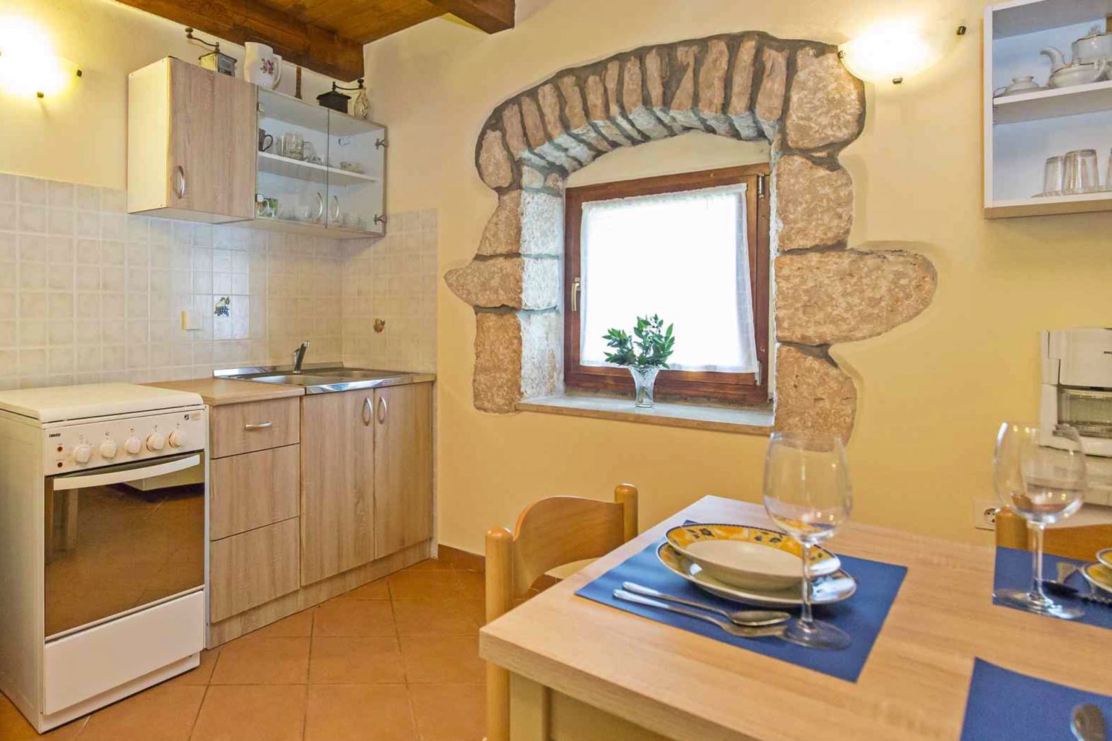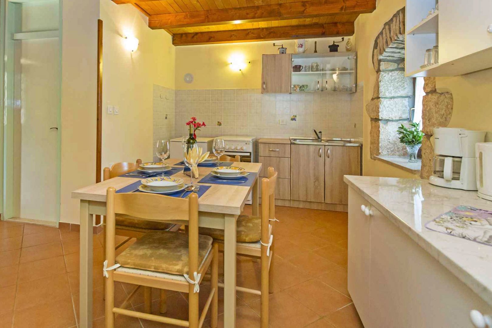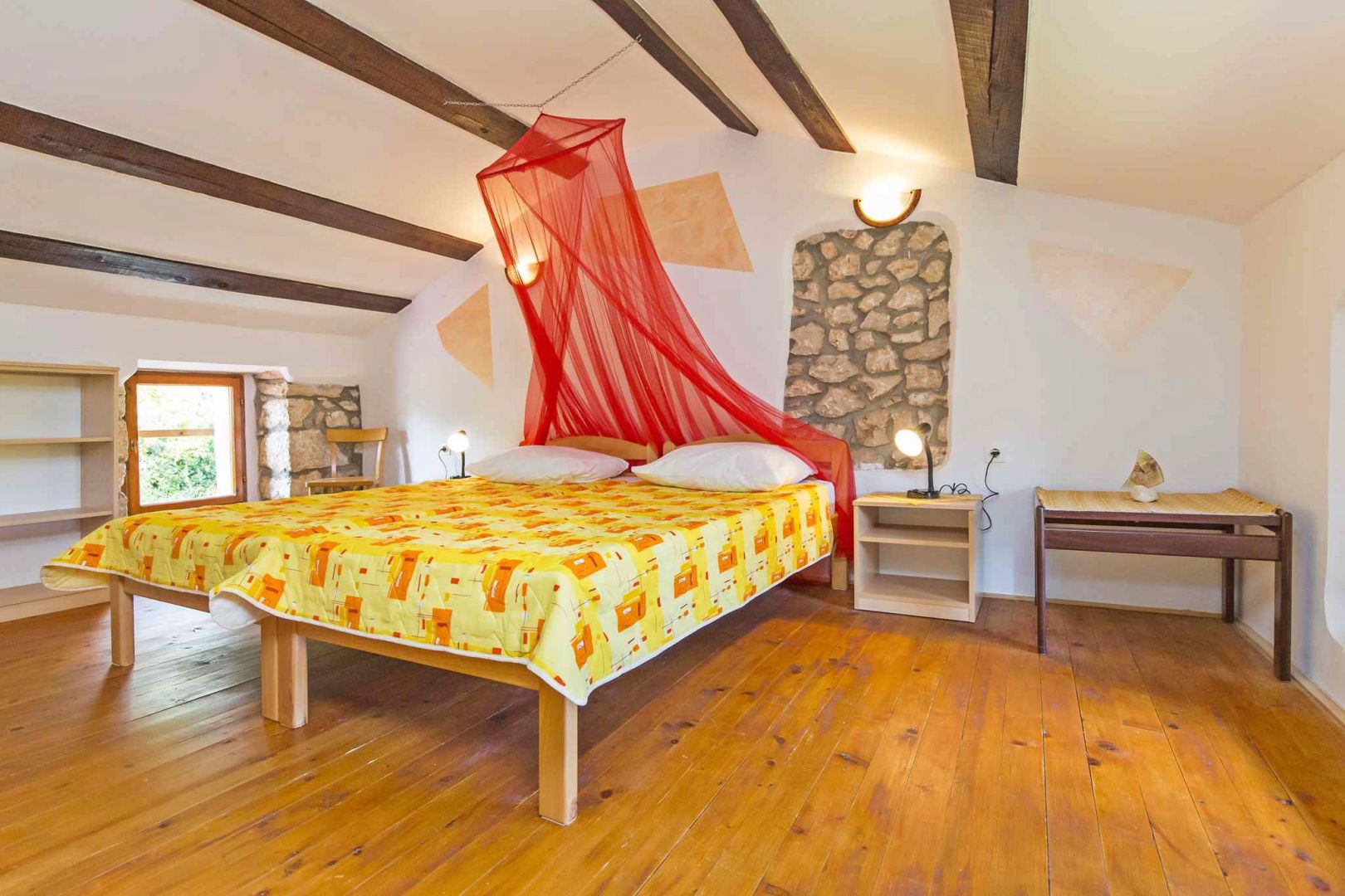A kőház egy földszintből és egy emeletből áll. A földszinten nappali, étkező, konyha és fürdőszoba, az emeleten pedig két tágas hálószoba található.