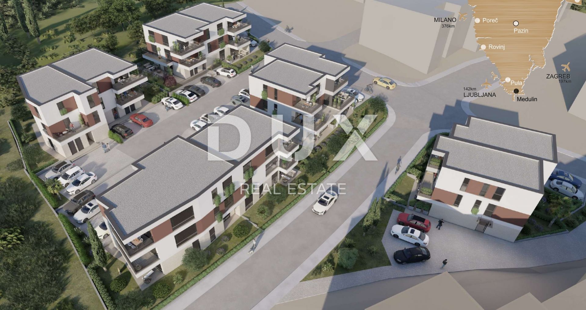 ISZTRIA, MEDULIN - Új épület nagy kerttel Medulin - egykor kis halászfalu, mára modern turisztikai központtá fejlődött minden előnyének köszönhetően, beleértve az enyhe mediterrán éghajlatot, a tiszta tengert és a tagolt partvonalat. Gazdag kulturális múltjának, lenyűgöző partvonalának és a tevékenységek, valamint látnivalók széles skálájának köszönhetően az Adriai-tenger egyik leghíresebb turisztikai célpontjává vált. A modern turisztikai központként elismert Medulin dinamikus és eseménydús nyaralást kínál. A szórakozásra vágyók számára a város számos kulturális rendezvényt szervez nyári koncertek, népzenei fesztiválok, horgászestek és kézműves vásárok formájában.