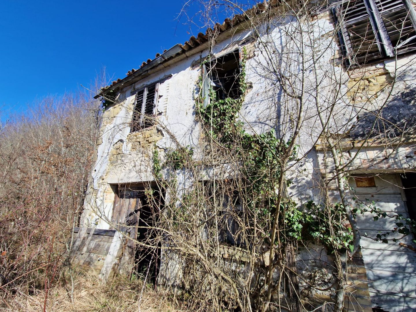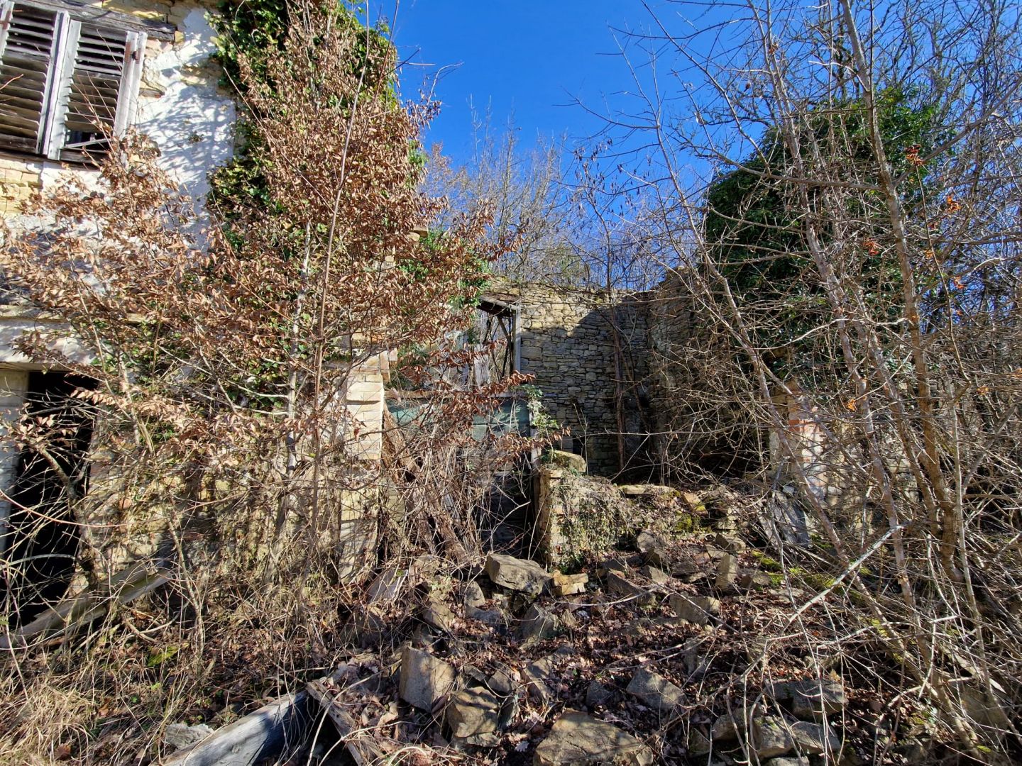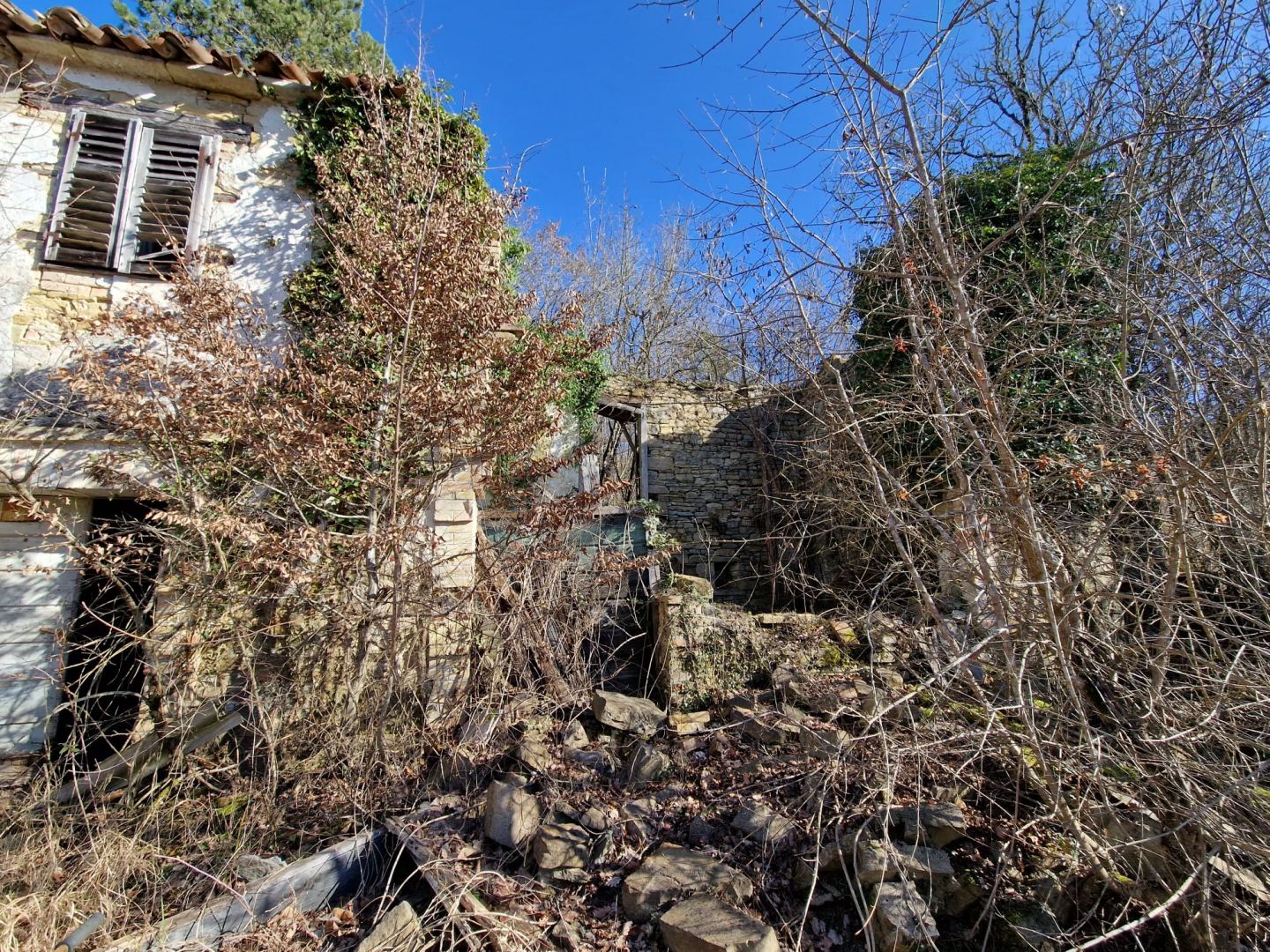 Egy magaslati helyen, panorámás kilátással az érintetlen természetre, található egy régi isztriai kőház, amely teljes felújításra szorul. Egy lenyűgöző, akár 46 007 m2-es telek veszi körül, amely építési és mezőgazdasági övezetek kombinációja.