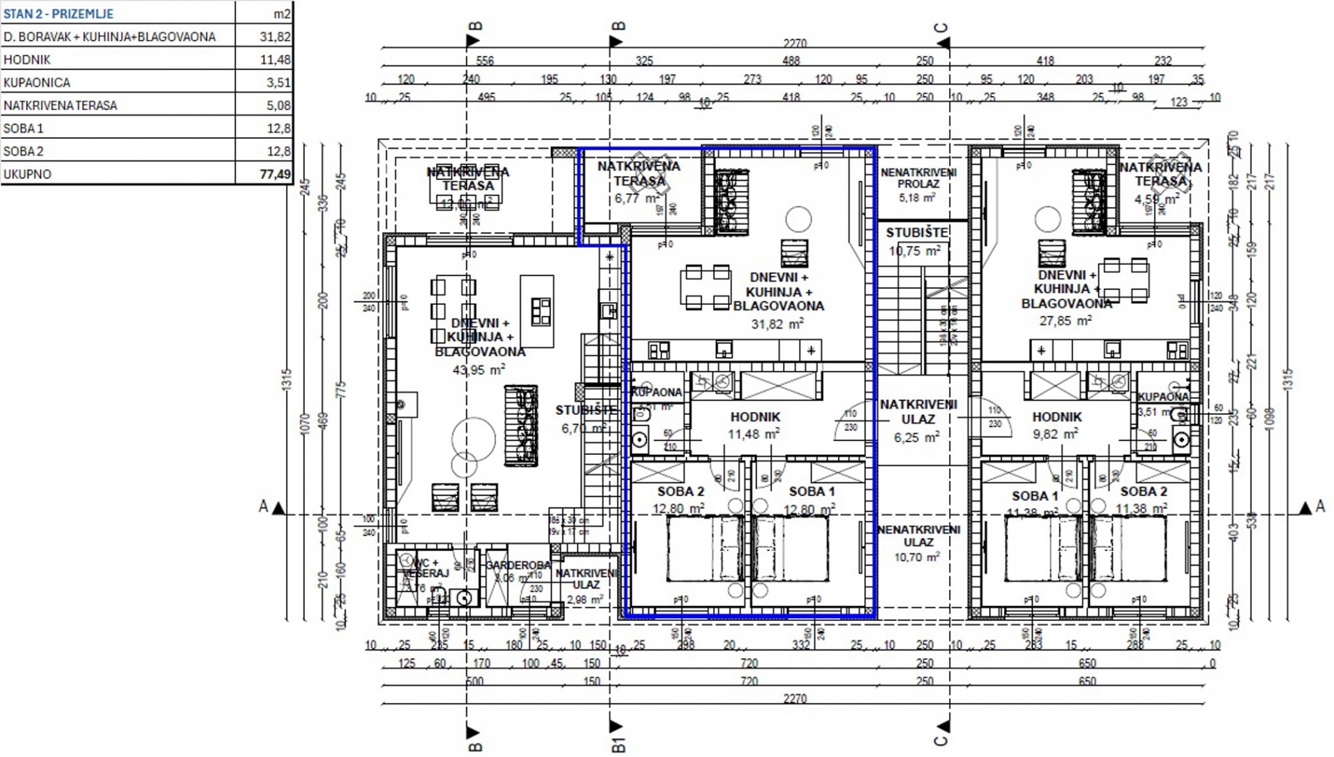 A DUX ingatlan kínálatában egy apartmant kínálunk egy új projektben, nagyszerű helyen, Poreč városában, iskolák, üzletek, strandok és minden egyéb szolgáltatás közelében. A projekt egy csendes utcában található, családi házakkal körülvéve, Poreč város zöldövezetének közvetlen közelében. A lakás 77,49 m2 lakóteret és 40 m2-es kertet kínál. A lakáshoz két parkolóhely és egy 5 m2-es tároló is tartozik. A munkálatok kezdete 2025. szeptember, várható befejezése 2026. december. MŰSZAKI JELLEMZŐK: 1. padlófűtés hőszivattyúval az egész lakásban 2. elektromos redőnyök szúnyoghálóval 3. 3 légkondicionáló 4. előkészítés elektromos autó töltőhöz A lakás egy előszobából, két hálószobából, fürdőszobából, nappaliból konyhával és étkezővel áll egy nyitott térben, ahonnan fedett teraszra és kertre lehet kijutni. Az eladó jogi személy, ezért a vevő mentesül az ingatlanadó megfizetése alól.