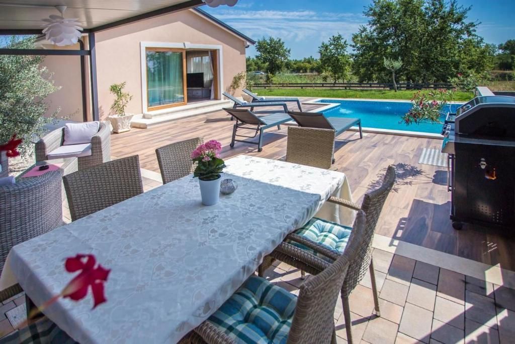 ISZTRIA, POREČ - Minőségi és meleg családi ház Poreč közelében. Egy kis településen, a kihagyhatatlan Poreč város közelében található ez a minőségi és meleg családi ház, amely figyelmet érdemel. AZ INGATLAN LEÍRÁSA; Az egyszintes villa egy tágas, 1063m2-es telken található, 85m2 lakóterületen belül melegségével, időtlen dekorációjával és kényelmével fog elvarázsolni. A villába belépve van egy kis folyosó, amely elválasztja a privát belső teret a mindennapi életet és szórakozást szolgáló résztől.