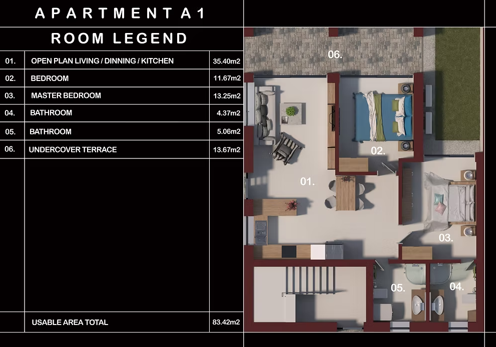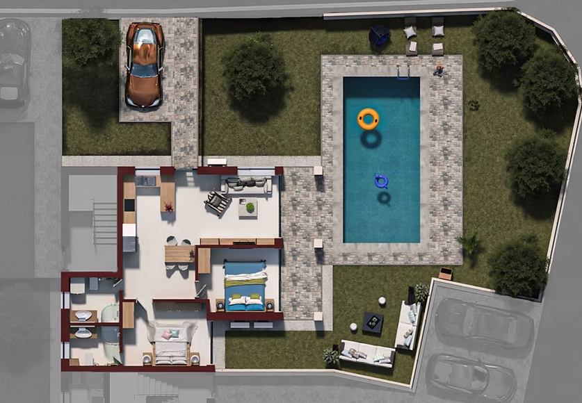 ISTRIA, POREČ – Modern luxus apartman Poreč városa az Adriai-tenger egyik legszebb gyöngyszeme, Isztria nyugati partján fekszik, és ma büszkén képviseli Nyugat-Isztria turisztikai, gazdasági és kulturális központját. 17 ezer lakosával, rendkívüli földrajzi elhelyezkedésével, természeti, kulturális szépségeivel, gazdag turisztikai kínálatával az elő- és utószezonban a Horvát Köztársaság, azaz az Európai Unió szintjén az elit turisztikai kínálat egyik birtokosa, és kellemes helyet kínál egész évben, ahol tartózkodni és élni lehet, számos minőségi városi életet biztosító szolgáltatással együtt. Az A1 apartman egy kétszobás, 83,42 m²-es apartman a földszinten, saját parkolóhellyel és 238 m²-es privát kerttel, amelyben elegendő hely van egy 4×8 m-es medence építésére. Az apartman egy nyitott nappaliból étkezővel és konyhával, 2 hálószobából, 2 fürdőszobából és egy fedett kültéri teraszból áll.