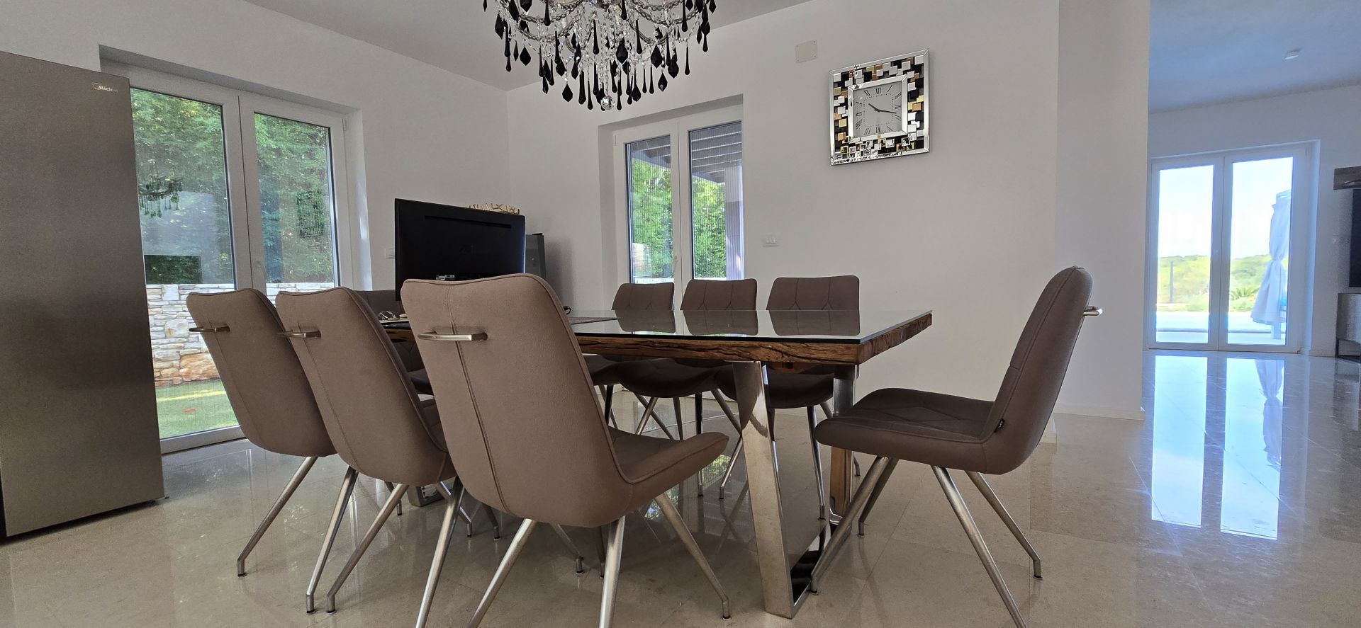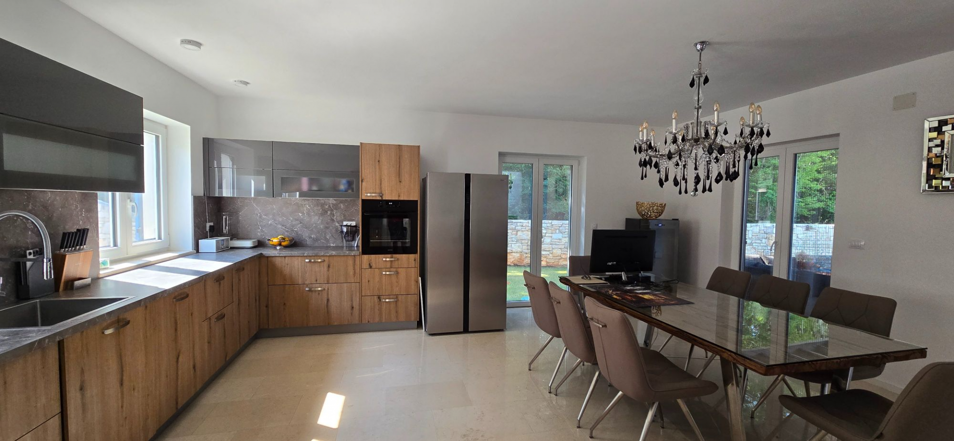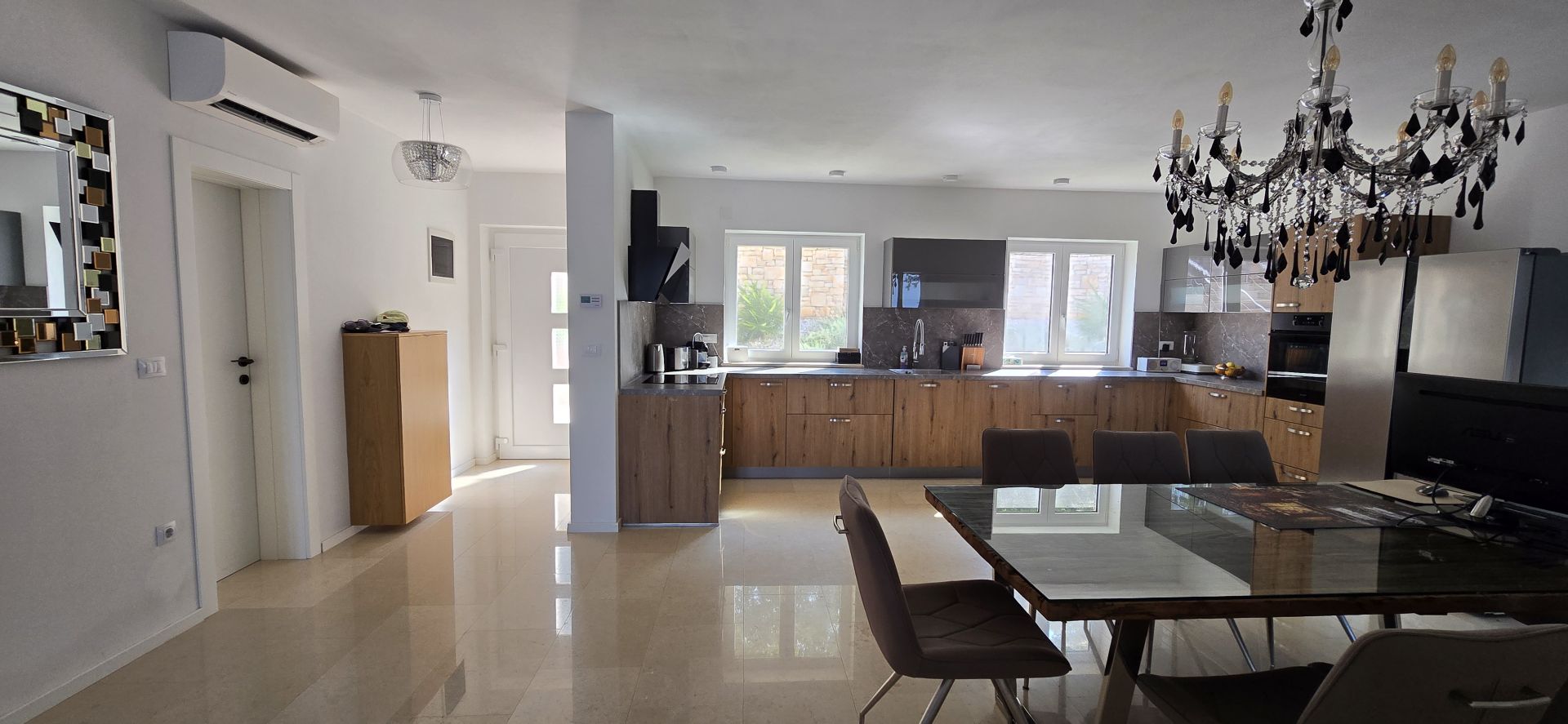ISZTRIA, ROVINJ - Új építésű villa medencével és további lakással, a falu szélén Az Isztriai-félsziget nyugati partján fekvő, festői szépségű, hangulatos Rovinj városa egykor kikötőként és halászfaluként működött, ma pedig az egyik legfejlettebb turisztikai célpont a hagyományos és a modern egyedi kombinációjával. Sikeresen ötvözi a halászfalu hagyományait a modern turisztikai trendekkel, gazdag gasztronómiai kínálattal és magas színvonalú turisztikai szolgáltatással. Pontosan ezért vonzza évről évre számos látogatót, és az elmúlt szezonok során rekordszámú, 3 millió éjszakát jegyeztek fel. A látogatók gyakran visszatérnek, miért ne válhatna e varázslatos város egyik értékes ingatlanának tulajdonosává? Ennek a gyönyörű városnak a szomszédságában eladó egy hangulatos új építésű medencés villa, gyönyörű erdőkkel, rétekkel körülvéve, kellő magánéletet és nyugalmat biztosítva a gondtalan élethez! A villa egy családi ház, amelynek nappalija a fő lakásban és egy további apartmanban található. 1. apartman: Az első lakás vagy a fő lakás 186,54 m2 alapterületű, és átnyúlik a földszinten és az első emeleten. A földszinten egy nyitott tér koncepcióban egy tágas konyha étkezővel és egy hatalmas nappali található a családdal. A terasz kijáratai lehetővé teszik a kommunikációt a nyári konyhával és az uszodával, ami rendkívül fontos azokban a hónapokban, amikor a kinti tartózkodás napi tevékenység. A földszint folytatásában a WC-hez vezető folyosó és a földszintet és az emeletet összekötő belső lépcsőház található. Az emeleten 3 gyönyörű hálószoba található, amelyeket egy folyosó és egy közös fürdőszoba köt össze. A hálószoba saját, 7,50 m2-es gardróbbal rendelkezik, és egy hatalmas teraszra nyílik, ahonnan zavartalan kilátás nyílik a természetre. A hálószoba mellett egy másik hálószobából nyílik a terasz. 2. apartman: A második lakás, vagy kis lakás 50 m2 alapterületű és szintén két szintes. A külön bejáratú apartman vendéglakásnak is ideális. A földszinten található a konyha, a nappali és az étkező, egy kis wc és az emeletre vezető belső lépcső. Az emeleten van egy hálószoba saját fürdőszobával. A 755 m2-es telken nyári konyha található szabadtéri étkezéshez. Vacsora után élvezheti a gyönyörű 32 m2-es fűtött úszómedencét (4m x 8m). Egy ilyen medence tavasszal és ősszel is lehetővé teszi a fürdőzést, ami nagymértékben meghosszabbíthatja a turisztikai szezont, ha erre a célra vásárolják meg az ingatlant. Két parkolóhely áll rendelkezésre bádog kedvenceinek, amelyek közül az egyik fedett. A ház 2020-ban épült, teljesen bútorozott és így is eladó. Fűtése padlós, hőszivattyús és klímával történik. Az első strand 6 km-re, Rovinj pedig 15 perces autóútra található. Használja ki az alkalmat, és legyen tulajdonosa ennek az idilli háznak egy csendes helyen! Ügynöki jutalék az Általános Szerződési Feltételek szerint kerül felszámításra.Ingatlan adatok