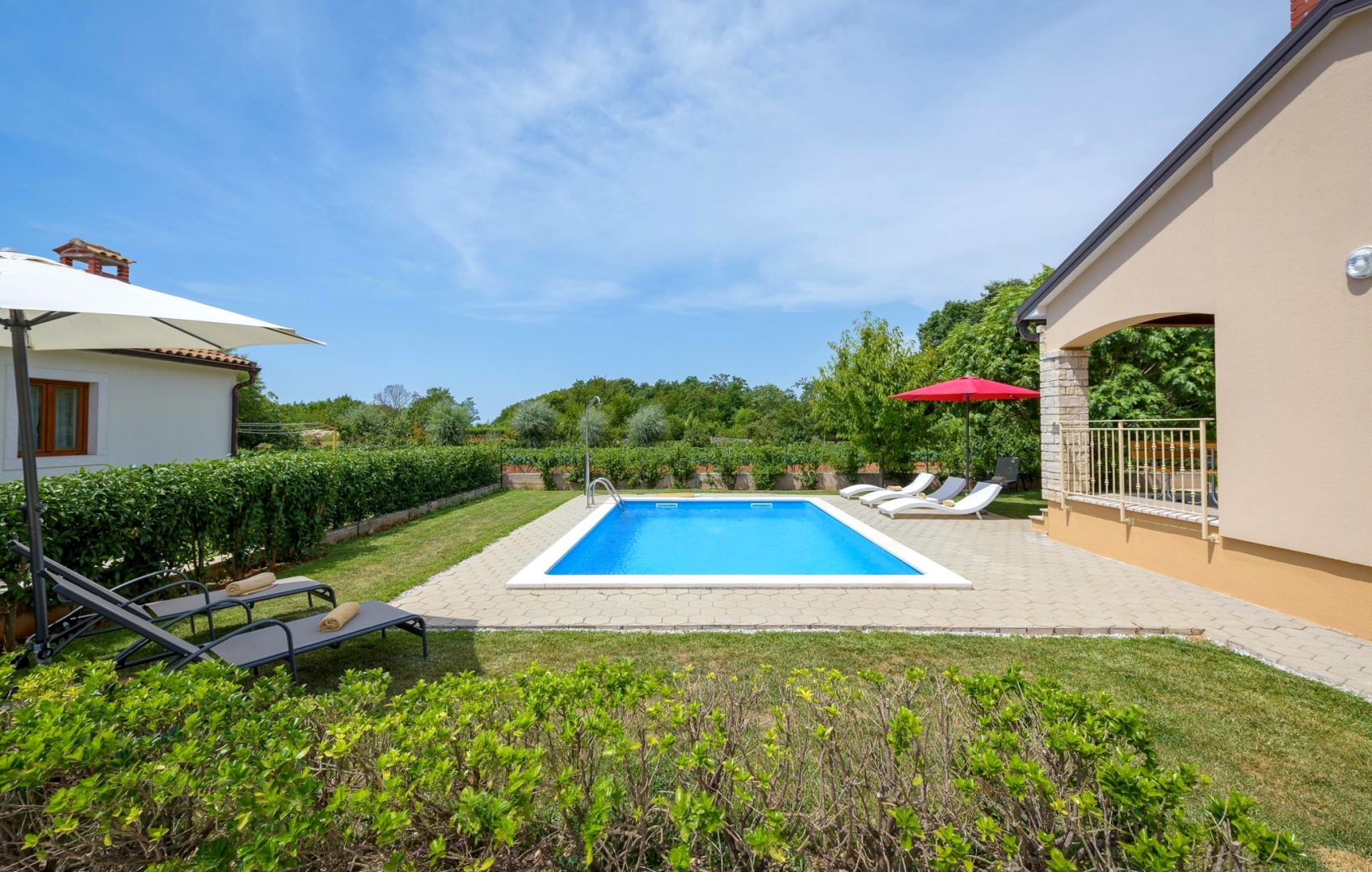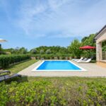 ISZTRIA, SVETI LOVREČ - Ház medencével a falu szélén A Sveti Lovreč egy dombon található, ahonnan gyönyörű kilátás nyílik a lankás mezőkre, szőlőültetvényekre, olajfaligetekre és a távolban a tengerre. Sveti Lovreč buja levendulamezők között fekszik az Isztriai-félsziget nyugati részén, Vrsar, Poreč és Rovinj közvetlen közelében, és Isztria egyik legjobban megőrzött középkori erődített városa. A város elhelyezkedése egy lankás dombon, amely uralja a területet, amelyen akár 22 település, falu és tanya is található, a történelem során betöltött jelentős szerepéről tanúskodik. Isztria enyhén tagolt nyugati partvidékén számos mély öböl emelkedik ki, amelyek közül a Lim-öböl részben Sveti Lovreč község területén található.