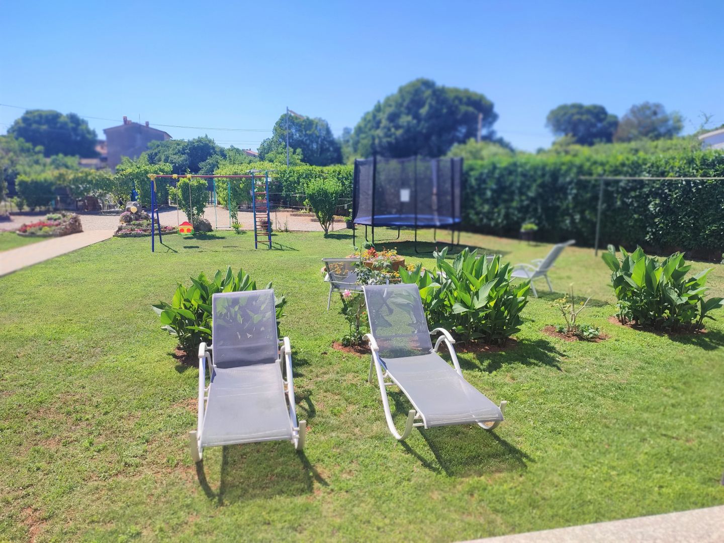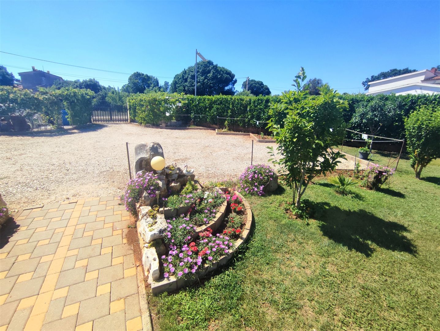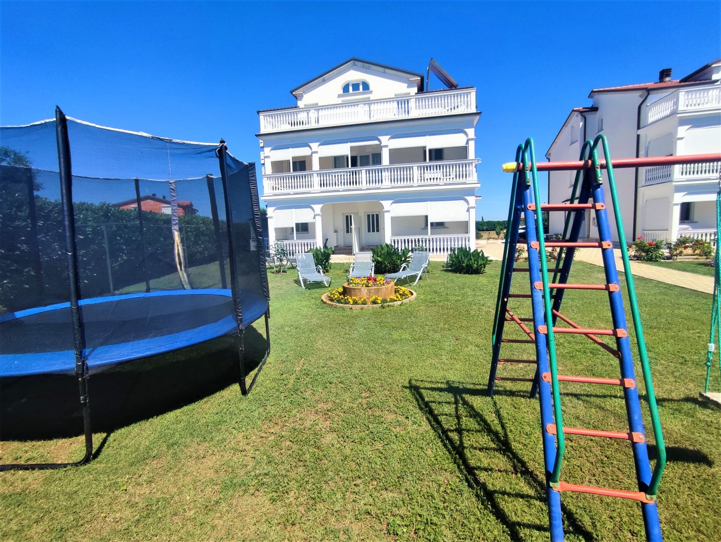 ISZTRIA, VALBANDON – Apartmanház a tenger közelében, 7 apartmannal és hatalmas kerttel Ez a tágas apartmanház Valbandon csendes részén található, mindössze 700 méterre a gyönyörű strandoktól és mindössze egy kilométerre Fažana központjától. A telek 1870 m2 alapterületű, 9 parkolóhely és egy ösvény a széles bejárati kaputól a házig. A ház bejáratait és az udvarok bejáratait figyelő biztonsági kamerarendszer is kiépítésre került. Az udvar egy része játszótérnek van kialakítva trambulinnal és hintákkal, az udvar egy része napozóágyakkal, egy része grillezésre alkalmas, valamint egy kerti sarok több olajfával.