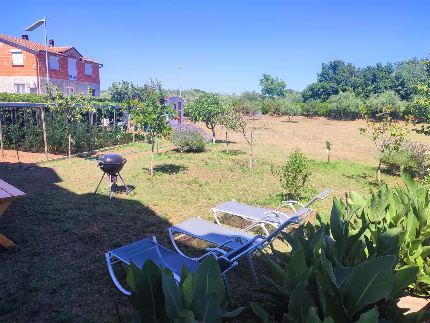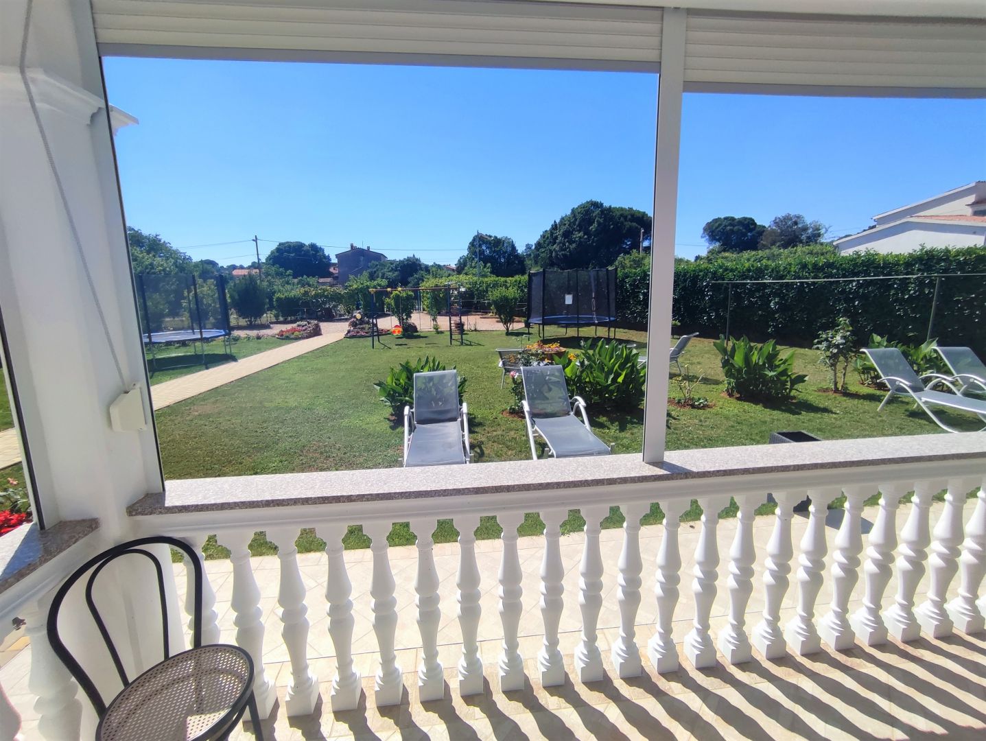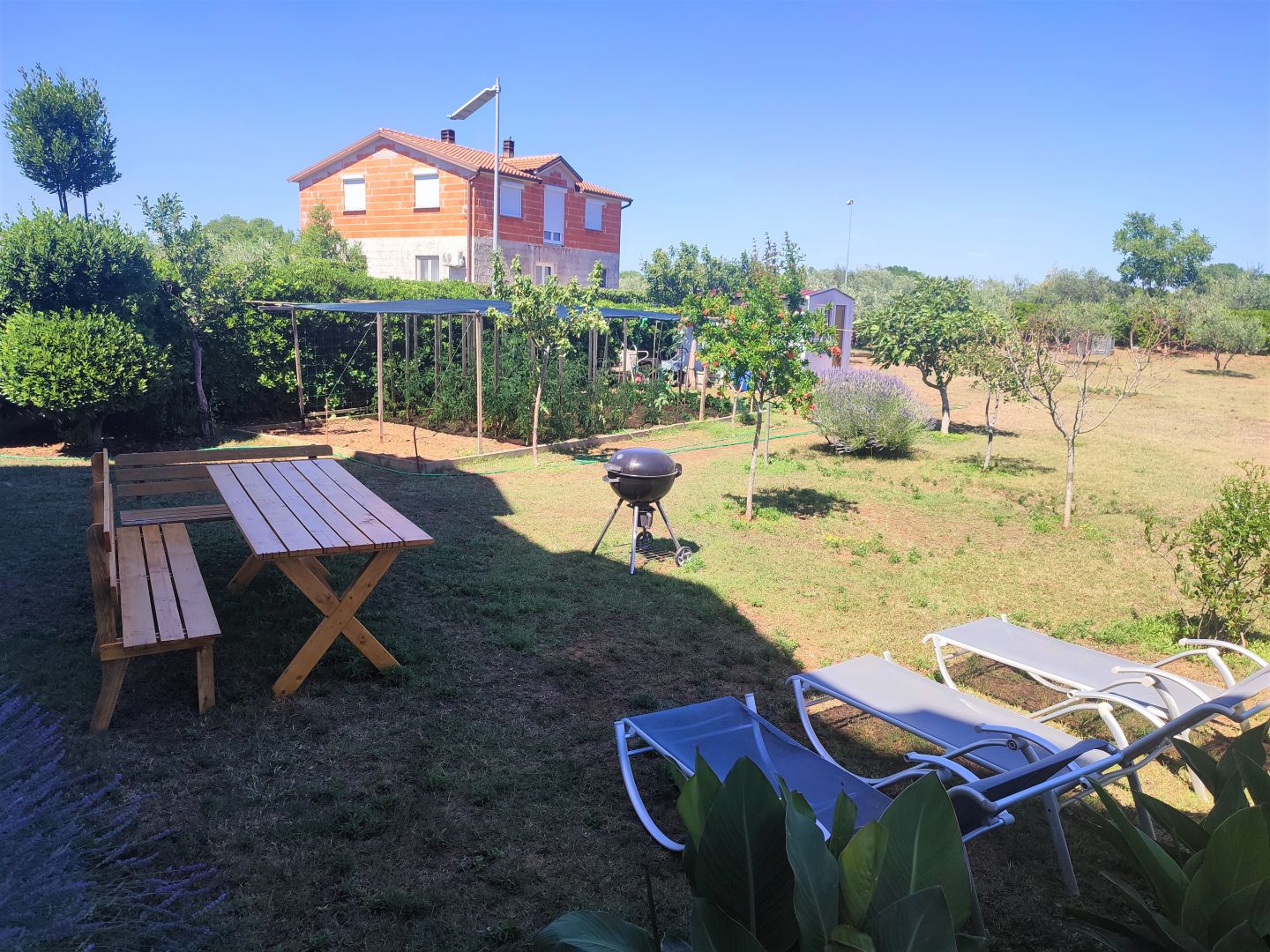 ISZTRIA, VALBANDON – Apartmanház a tenger közelében, 7 apartmannal és hatalmas kerttel Ez a tágas apartmanház Valbandon csendes részén található, mindössze 700 méterre a gyönyörű strandoktól és mindössze egy kilométerre Fažana központjától. A telek 1870 m2 alapterületű, 9 parkolóhely és egy ösvény a széles bejárati kaputól a házig. A ház bejáratait és az udvarok bejáratait figyelő biztonsági kamerarendszer is kiépítésre került. Az udvar egy része játszótérnek van kialakítva trambulinnal és hintákkal, az udvar egy része napozóágyakkal, egy része grillezésre alkalmas, valamint egy kerti sarok több olajfával.
