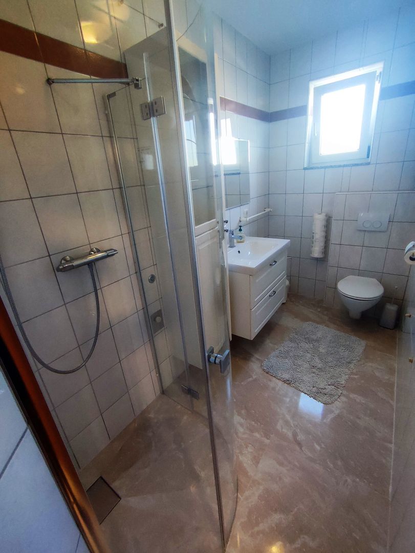 Ez a tágas apartmanház Valbandon csendes részén található, mindössze 700 méterre a gyönyörű strandoktól és mindössze egy kilométerre Fažana központjától. A telek 1870 m2 alapterületű, 9 parkolóhely és egy ösvény a széles bejárati kaputól a házig. A ház bejáratait és az udvarok bejáratait figyelő biztonsági kamerarendszer is kiépítésre került. Az udvar egy része játszótérnek van kialakítva trambulinnal és hintákkal, az udvar egy része napozóágyakkal, egy része grillezésre alkalmas, valamint egy kerti sarok több olajfával. A ház teljes lakóterülete 405 m2, és 3 szintes, ami a földszintből, 1. emeletből és 2. emeletből áll. A ház földszintjén 4 külön bejáratú apartman található. Három apartman a földszinten egy nappali konyhával és étkezővel, hálószoba, terasz és fürdőszoba található. A negyedik lakás a földszinten valamivel kisebb, és egy hálószobával, konyhával, terasszal és fürdőszobával rendelkezik. Belső lépcső vezet az 1. emeletre, ahol egy nagy, 135 m2-es lakás található. Található benne egy tágas előszoba, egy modern konyha, egy tágas teraszra nyíló nappali, egy étkező, 2 hálószoba, melyek közül az egyik saját fürdőszobával, a másik pedig terasszal rendelkezik. A 2. emeletre belső lépcső vezet, ahol 2 külön bejáratú apartman található. A kisebb apartman egy konyhából, fürdőszobából és egy nagy nappaliból áll, kanapéval és egy franciaággyal. A nappali egy nagy teraszra nyílik, és az egész lakás nagyon jól megvilágított és modern berendezésű. A 2. emeleti nagyobb lakásban egy nappali konyhával és étkezővel, 2 hálószoba, melyből az egyik teraszra nyílik, egy fürdőszoba és egy további, a nappaliból megközelíthető kisebb terasz található. A ház földszintjén található egy helyiség, ahol a napkollektorokkal fűtött kazánok találhatók, vízmelegítésre és az 1. és 2. emeleten kiépített padlófűtésre szolgálnak. Ha a leendő tulajdonos a fűtési lehetőség mellett dönt, az egész házban központi fűtési vezetékek vannak kivezetve. Minden apartman légkondicionált. Az udvaron vízkút is található. Ez a háztípus ideális a turizmusban történő bérbeadásra, befektetés megtérüléseként, egy már működő vállalkozás átvételére. Az ingatlan megérdemli a figyelmet és ideális lehetőség! 1/2 tulajdon, férj és feleség, tehermentes.