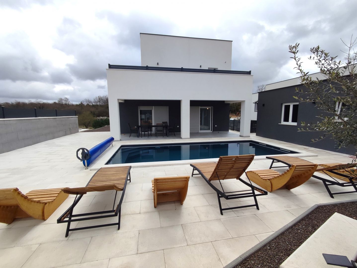 ISZTRIA, VODNJAN – Modern villa 195m2, fűtött medence, szauna, jacuzzi, fényűzően berendezett 2022-ben épült modern villát kínálunk egy Vodnjan melletti kisvárosban, csendes, természettel körülvett helyen, mely nyugalmat és magánéletet biztosít. A villa egy 601 m2 összterületű telken található. A telek bejáratánál aszfaltozott parkoló fogad, amely a napozó részhez vezet, ahol egy 32 m2-es fűtött medence és a hozzá tartozó létesítmények találhatók. A medence mellett található egy melléképület zuhanyzóval, szaunával és jacuzzival. A villa teljes lakóterülete 195 m2, 2 föld feletti szintre osztva, egy lakóegységként kialakítva: A földszinten előszoba, vendég WC, 1 hálószoba saját fürdőszobával és egy nagy ” nyitott terű terület, amely nappaliból, konyhából és étkezőből áll. Az uszodával és a napozórésszel való kommunikáció üvegfalakon keresztül történik, amelyek egész nap megvilágítják a nappalit. A fedett udvarrészen szabadtéri étkezőasztal is található. Belső lépcső vezet a felső szintre, ahol van még 2 hálószoba, mindegyik saját fürdőszobával és kijárattal egy nagy szabadtéri teraszra, ahonnan kilátás nyílik a természetre.