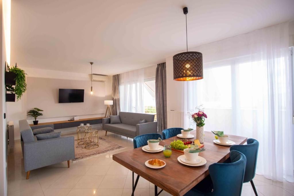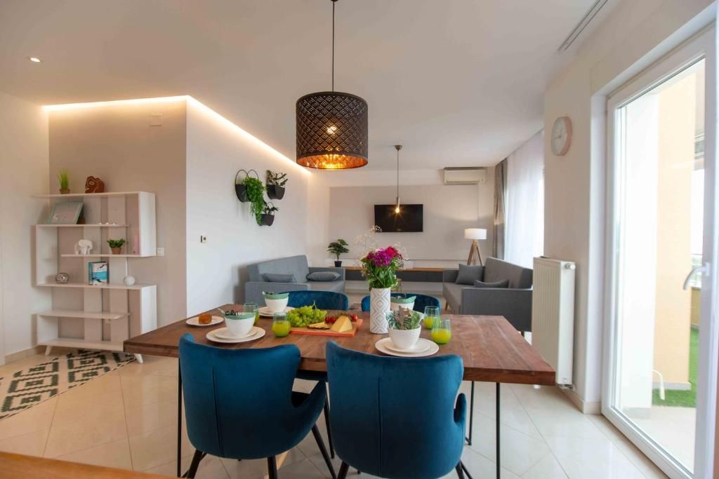 KOSTRENA - Gyönyörű apartman terasszal és nyílt tengerre néző kilátással, kiváló helyen A DUX kínálatában egy tágas lakást emelünk ki a Doričići településen, Kostrenában, összesen 105 m²-es lakóterülettel. 20 m2-es melléképülettel. A vonzó helyen található apartman tökéletesen ötvözi a kényelmet, a funkcionalitást és a tenger közelségét, így ideális választás egy kellemes élethez. A lakás egy előszobából, egy tágas nappaliból áll, amely összeköttetésben áll a konyhával és az étkezővel.