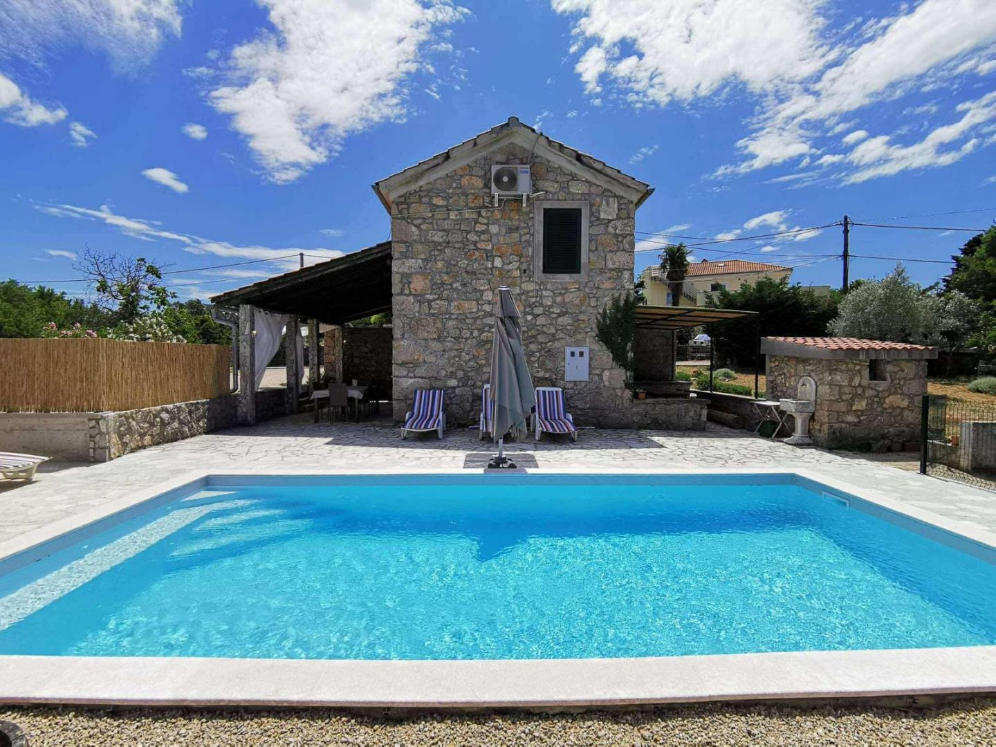 KRK SZIGET, DOBRINJ – Kővilla medencével és tengerre néző kilátással, LEHETŐSÉG!!! Ez a bájos kőház, amelyet 2021-ben teljesen felújítottak, a hiteles mediterrán stílus és a modern kényelem tökéletes keverékét testesíti meg. Egy 960 m²-es telken található, és 100 m² lakóteret kínál két szinten. A földszinten egy tágas nappali található fatüzelésű kályhával, konyha és étkező, míg az emeleten két hálószoba, fürdőszoba, egy nagy előszoba kanapéággyal és kijárattal a tengerre néző teraszra.