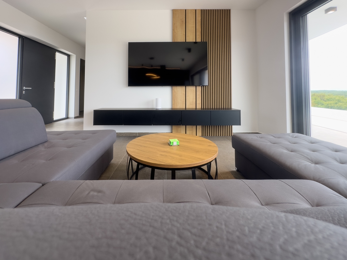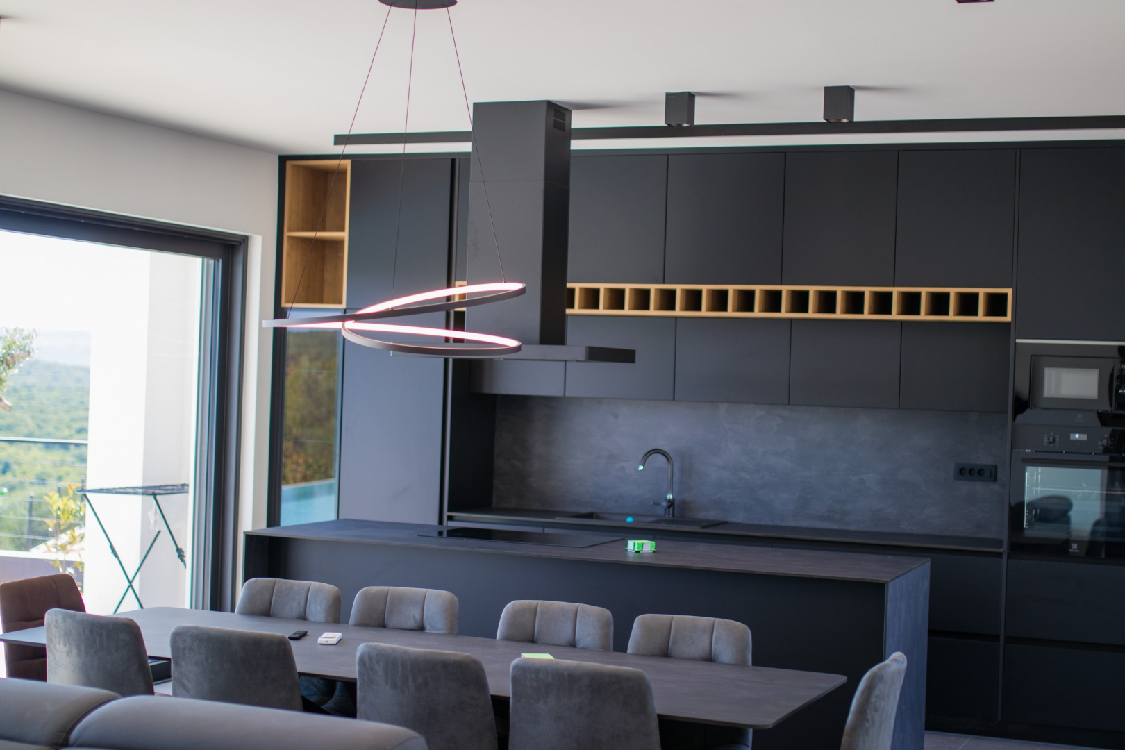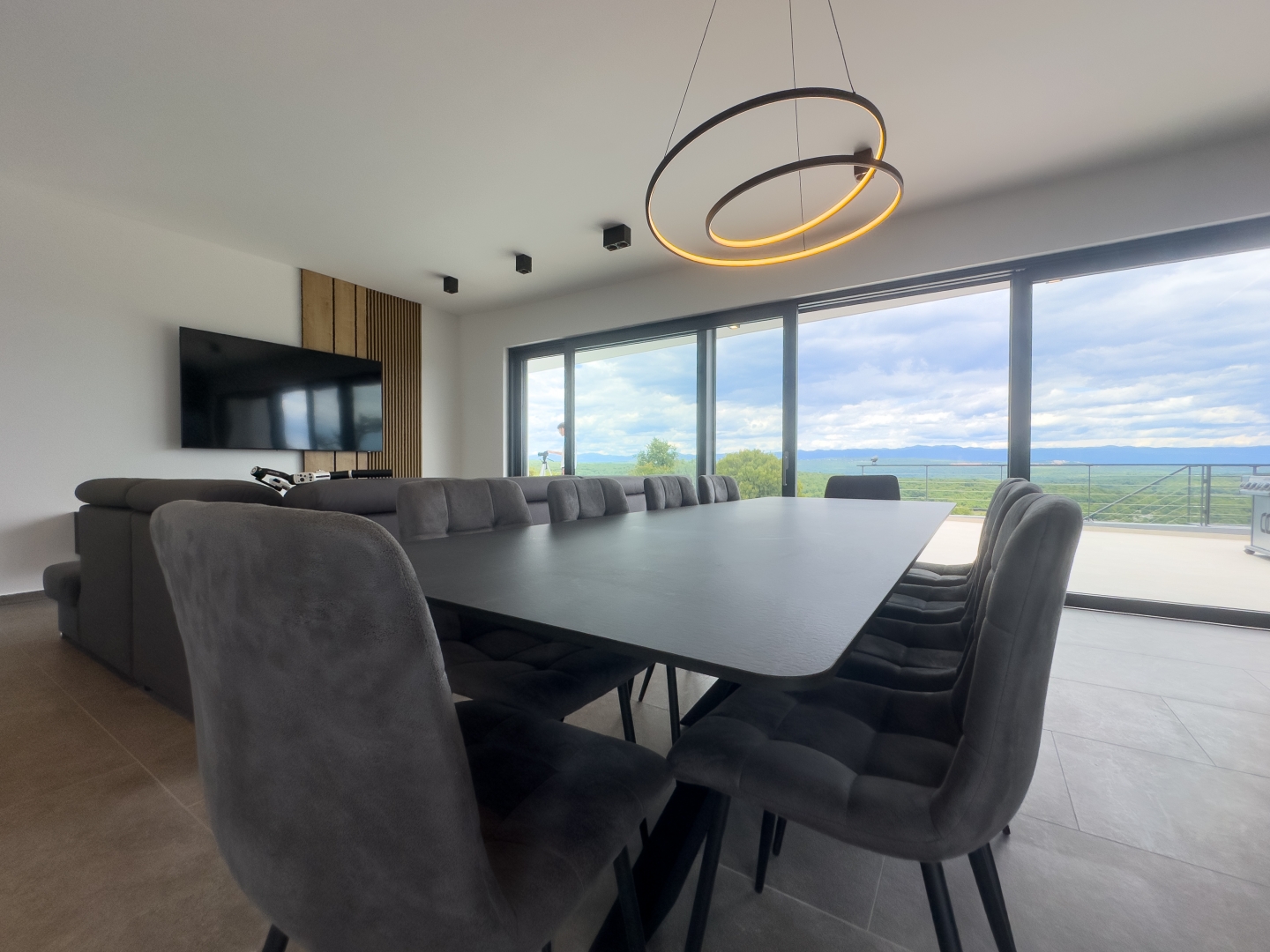 Ez a gyönyörű modern villa egy 730 m2-es telken épült, Krk város közelében, az építési övezet szélén, egy magaslati helyen, amely örök panorámás kilátást garantál. A villa földszintjén garázs, mosókonyha tárolóval, fürdőszoba, edzőterem, konyha étkezővel és nappali található, ahonnan kijárat nyílik egy gyönyörűen parkosított kertbe, ahol végtelenített medence, napozóterasz, fedett terasz és grillező található. Az első emeleten négy hálószoba található, mindegyik saját fürdőszobával, amelyek közül háromhoz erkély tartozik, ahonnan gyönyörű kilátás nyílik a környező természetre és a tengerre. A villa ritka lehetőséget kínál a piacon, ötvözve a luxus lakóteret, a fantasztikus elhelyezkedést és számos kényelmi szolgáltatást, így ideális mindazok számára, akik kiváló minőségű otthont vagy értékes befektetést keresnek Krk szigetén. A főutak közelsége könnyű hozzáférést biztosít az egész szigethez, így Krk városa ideális kiindulópont a sziget felfedezéséhez. Természeti szépségük, kulturális kínálatuk és elsőrangú gasztronómiai életük kombinációja miatt népszerűek a turisták körében, így Krk szigetének egyik legkeresettebb úti célja. A szakmai tanácsadás mellett az ingatlanügynökség szolgáltatása magában foglalja a teljes tulajdonjogi dokumentáció ellenőrzését, az új tulajdonos ingatlan-nyilvántartásba történő bejegyzéséhez szükséges összes jogi dokumentum elkészítését. Ha minket választ, a Dux ingatlanügynökség örömmel segít Önnek megbízható cégek kiválasztásában az ingatlan berendezéséhez, valamint a legkedvezőbb hitelkeret megszerzésében. Minden további kérdés, megtekintés, vásárlás és foglalás esetén ingatlanügynök áll rendelkezésére! Ma Krk szigetét kivételes kulturális és művészeti örökséggel rendelkező turisztikai célpontként ismerjük, ahol az ősi Splendidisima Civitas Curitarum (Krk népének pompás városa) harmóniában él a modern kor nyüzsgő jellegével. Az ideális földrajzi elhelyezkedés egy olyan előny, amelyet Krk szigete nagyon jól tudott értékelni a turizmus szempontjából. A szárazföldhöz való közelségről beszélünk, amelyhez körülbelül húsz évvel ezelőtt egy hidat építettek, amely összeköti Krk szigetét a szárazfölddel, így még könnyebben megközelíthetővé téve azt. A jó közlekedési kapcsolatoknak köszönhetően Krk szigete kedvelt kirándulóhely, de fordítva is igaz ez: érdekes egynapos kirándulásokat tehet a szigetről. Például ellátogathat a Plitvicei-tavakba és az Északi-Velebit Nemzeti Parkba. Az igazi felfedezők mindenképpen szeretnék megismerni Rijekát – a Primorje-Gorski Kotar megye központját, és rijekai tartózkodásukat összekapcsolják egy elkerülhetetlen Abbázia – az Adriai-tenger turisztikai gyöngyszemének – látogatásával. Nagyon érdekes lesz egy egynapos kirándulás Isztriára, ahol inkább a sziget középső részén ajánljuk a tartózkodást, mint a tengerparton! Végül Krk szigetét komppal kötik össze három szigettel: Rab, Cres, Lošinj, amelyek szintén egynapos kirándulásaik célpontjai lehetnek.