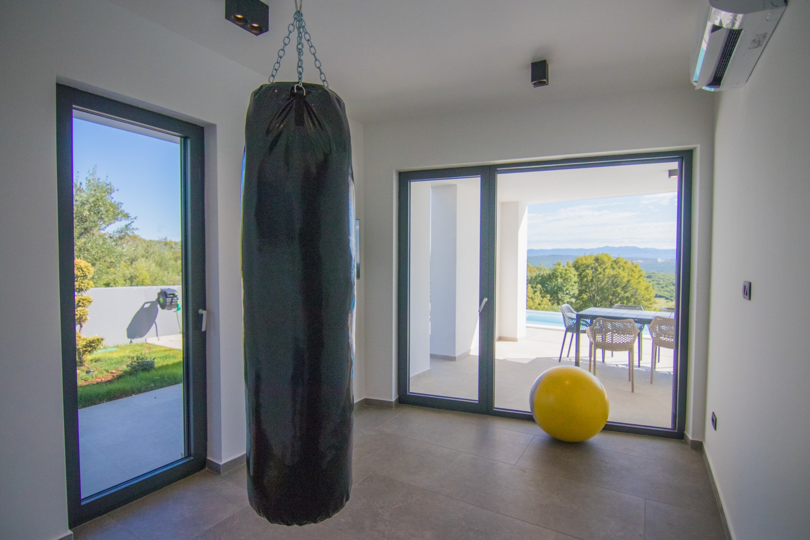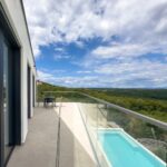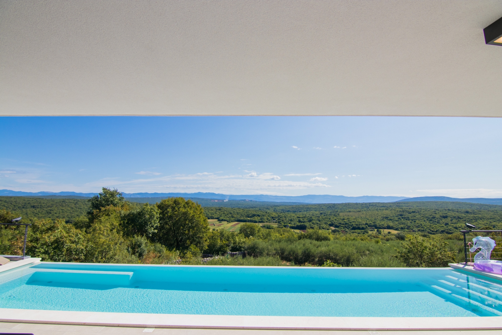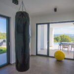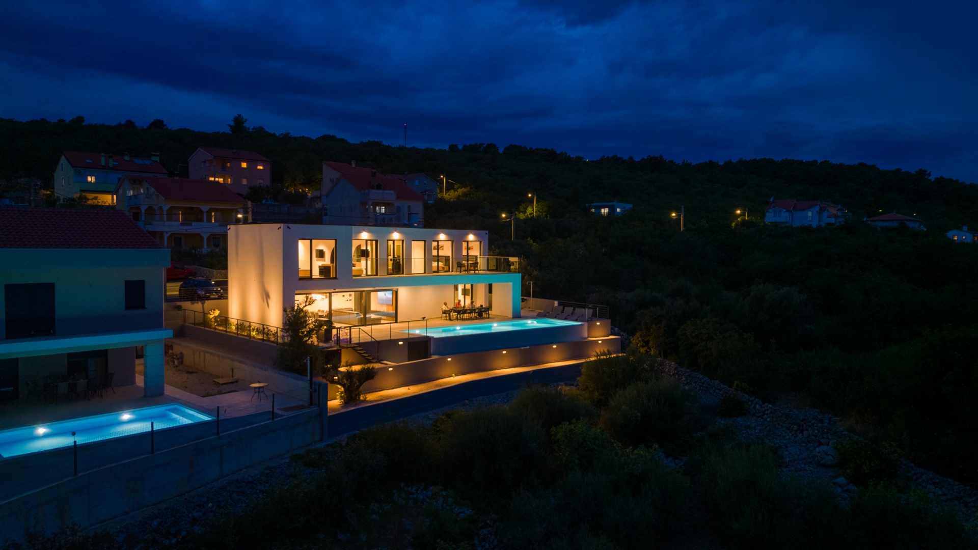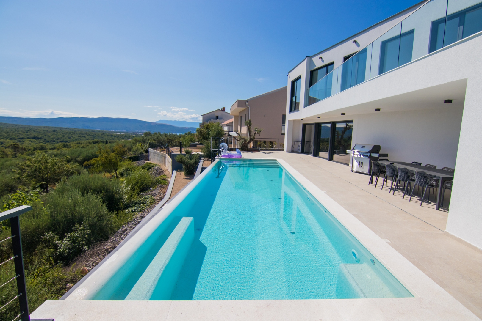 KRK SZIGET, KRK VÁROS – környezet – luxusvilla Ez a gyönyörű modern villa egy 730 m2-es telken épült, Krk város közelében, az építési övezet szélén, egy magaslati helyen, amely örök panorámás kilátást garantál. A villa földszintjén garázs, mosókonyha tárolóval, fürdőszoba, edzőterem, konyha étkezővel és nappali található, ahonnan kijárat nyílik egy gyönyörűen parkosított kertbe, ahol végtelenített medence, napozóterasz, fedett terasz és grillező található. Az első emeleten négy hálószoba található, mindegyik saját fürdőszobával, amelyek közül háromhoz erkély tartozik, ahonnan gyönyörű kilátás nyílik a környező természetre és a tengerre. A villa ritka lehetőséget kínál a piacon, ötvözve a luxus lakóteret, a fantasztikus elhelyezkedést és számos kényelmi szolgáltatást, így ideális mindazok számára, akik kiváló minőségű otthont vagy értékes befektetést keresnek Krk szigetén.