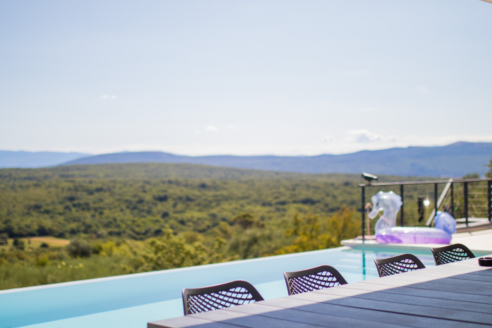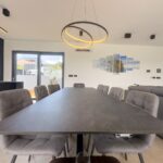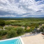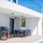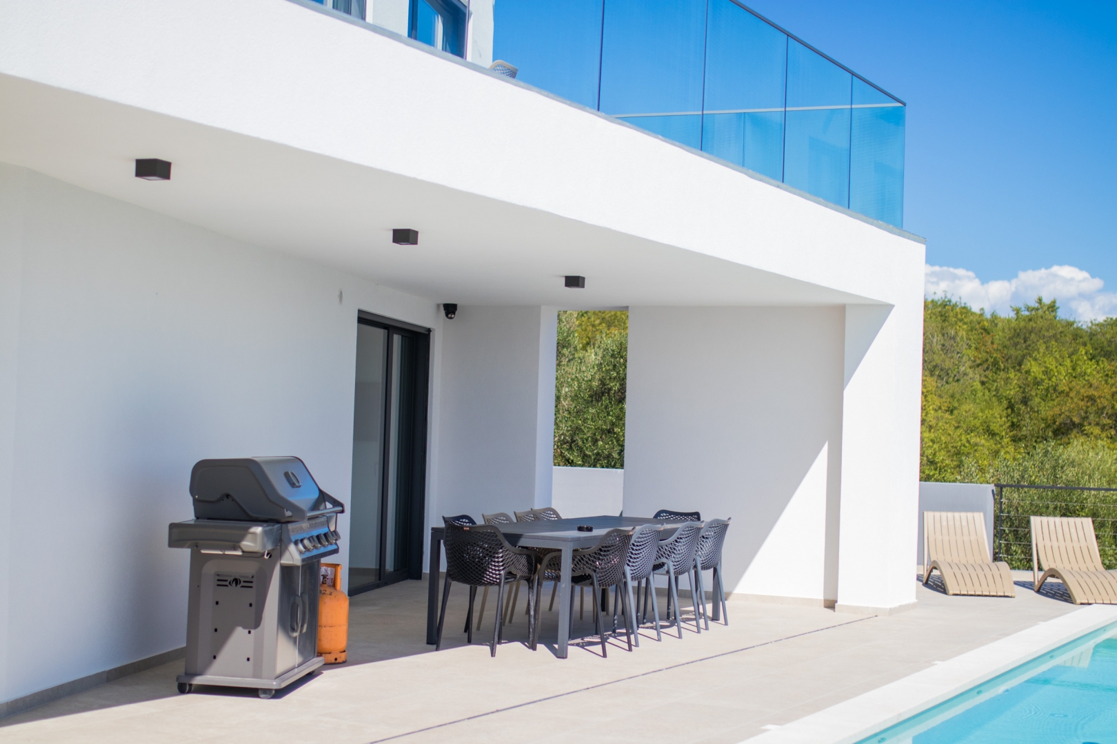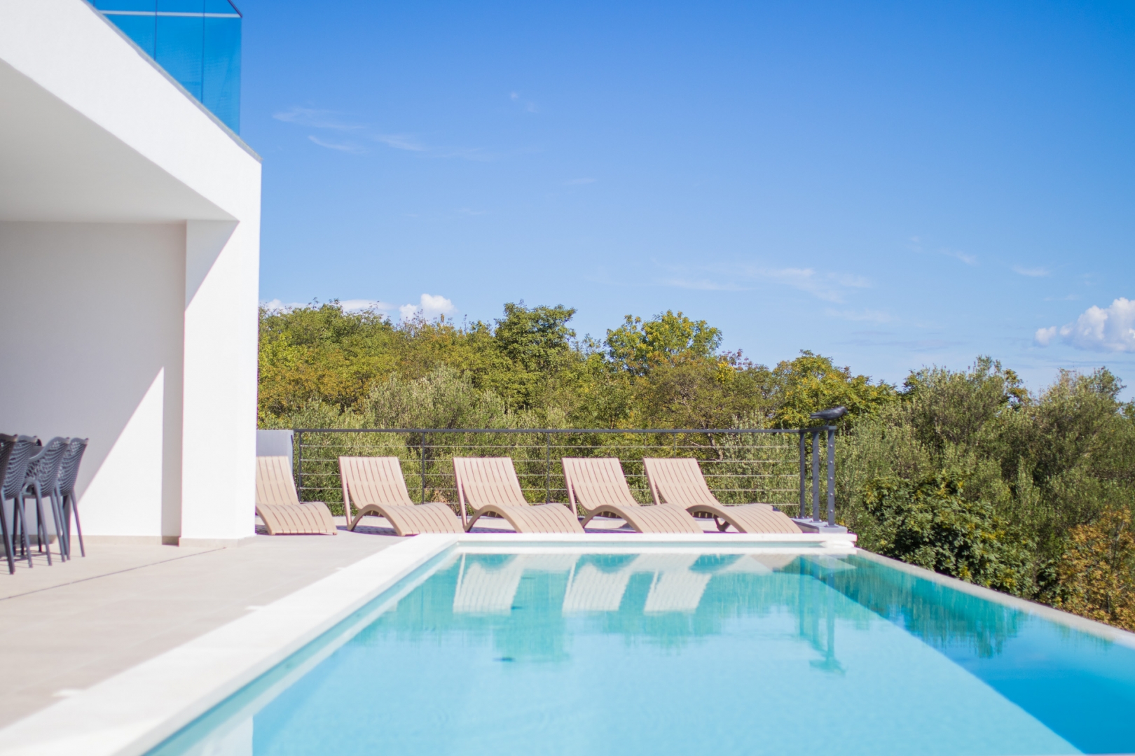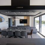 KRK SZIGET, KRK VÁROS – környezet – luxusvilla Ez a gyönyörű modern villa egy 730 m2-es telken épült, Krk város közelében, az építési övezet szélén, egy magaslati helyen, amely örök panorámás kilátást garantál. A villa földszintjén garázs, mosókonyha tárolóval, fürdőszoba, edzőterem, konyha étkezővel és nappali található, ahonnan kijárat nyílik egy gyönyörűen parkosított kertbe, ahol végtelenített medence, napozóterasz, fedett terasz és grillező található. Az első emeleten négy hálószoba található, mindegyik saját fürdőszobával, amelyek közül háromhoz erkély tartozik, ahonnan gyönyörű kilátás nyílik a környező természetre és a tengerre. A villa ritka lehetőséget kínál a piacon, ötvözve a luxus lakóteret, a fantasztikus elhelyezkedést és számos kényelmi szolgáltatást, így ideális mindazok számára, akik kiváló minőségű otthont vagy értékes befektetést keresnek Krk szigetén.