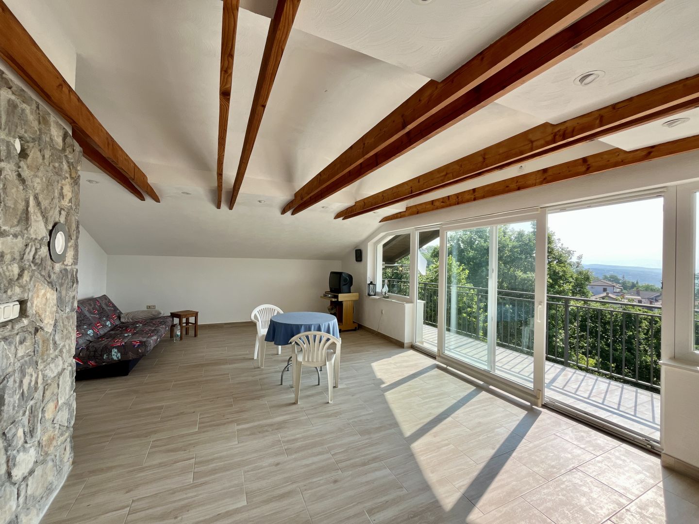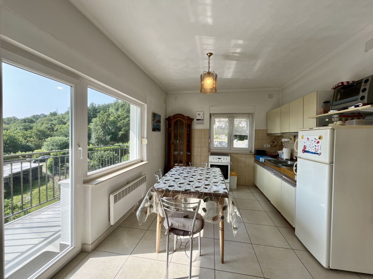 Mindössze 6 km-re Opatijától és a tengertől, egy békés, zöldövezetben, madarakkal és napsütésben gazdag környezetben található ez a kivételes, 318 m²-es családi ház tengerre néző kilátással. A ház egy körülbelül 1800 m²-es telken terül el, és három szinten helyezkedik el: Földszint: kétszobás apartman befejezetlen állapotban és egy nagy taverna saját fürdőszobával. Első emelet: bútorozott apartman, amely egy tágas nappaliból, konyhából és étkezőből, két hálószobából, fürdőszobából és nagy erkélyből áll. Második emelet (magas padlás): az első emelettel megegyező elrendezésű apartman, teljesen kulcsrakész rendszerben elkészítve. A helyszín teljes magánéletet, nyugalmat és csendet kínál, állandó napfény jelenlétével, és ami ezt az ingatlant megkülönbözteti, az a gyönyörű és gondosan parkosított kert. A tulajdonosok háromszor is elnyerték a legszebb kert díjat kertjükért és kerttervezésükért, ami igazolja a minden részletre kiterjedő figyelmet és szeretetet. A fűtés fával vagy elektromos árammal lehetséges, és az egész ingatlant különös gonddal karbantartották. A ház Rukavac egy csendesebb részén található, ideális a pihenésre és kikapcsolódásra, ugyanakkor mindössze 8-10 perces autóútra van minden alapvető szolgáltatástól – üzletektől, iskoláktól, óvodáktól és klinikáktól. Ideális nagycsaládosoknak, többtagú háztartásoknak vagy turisztikai befektetésnek.