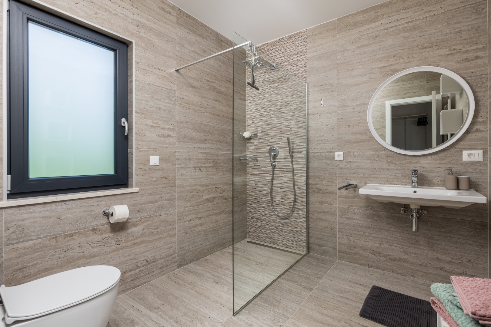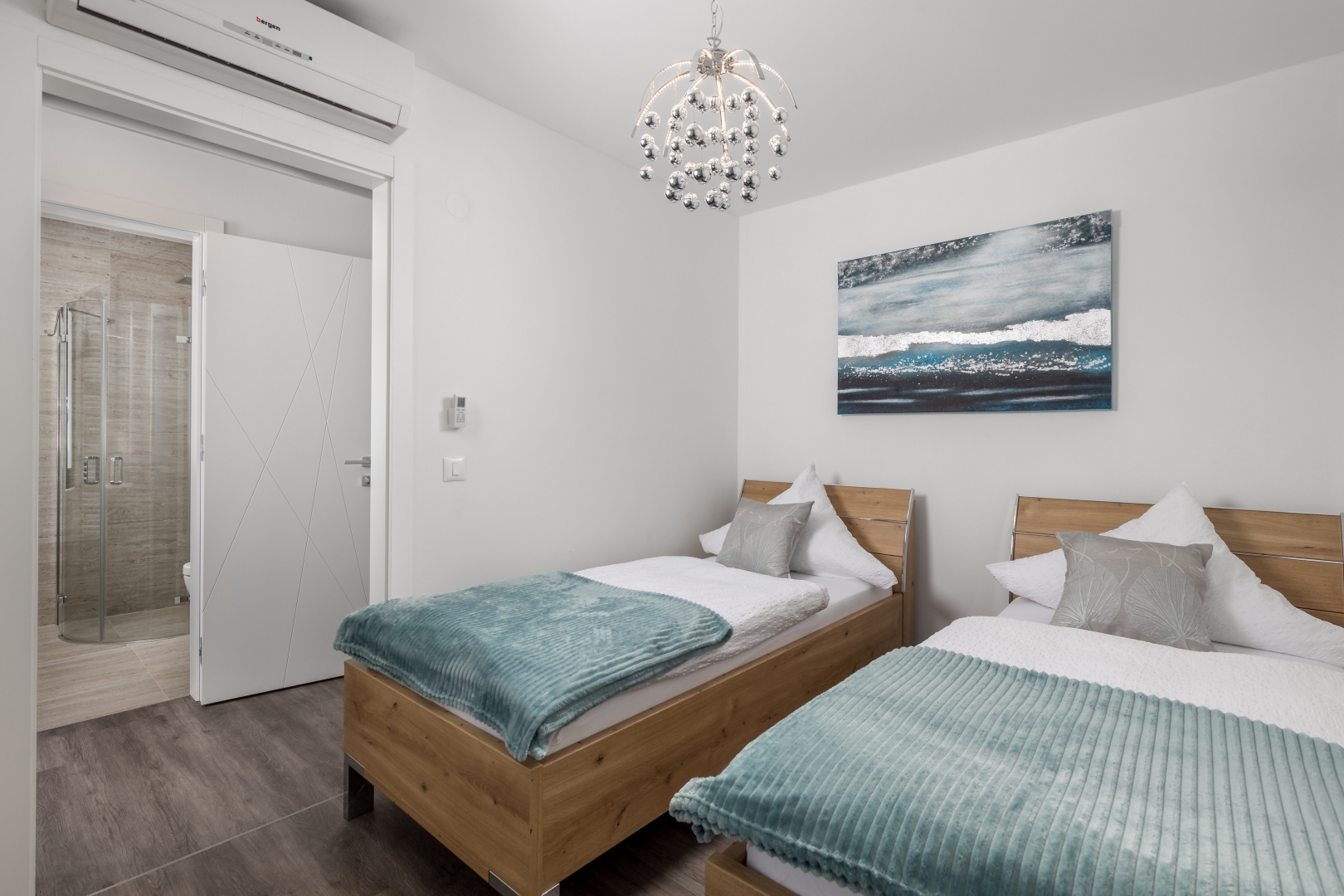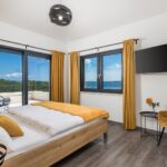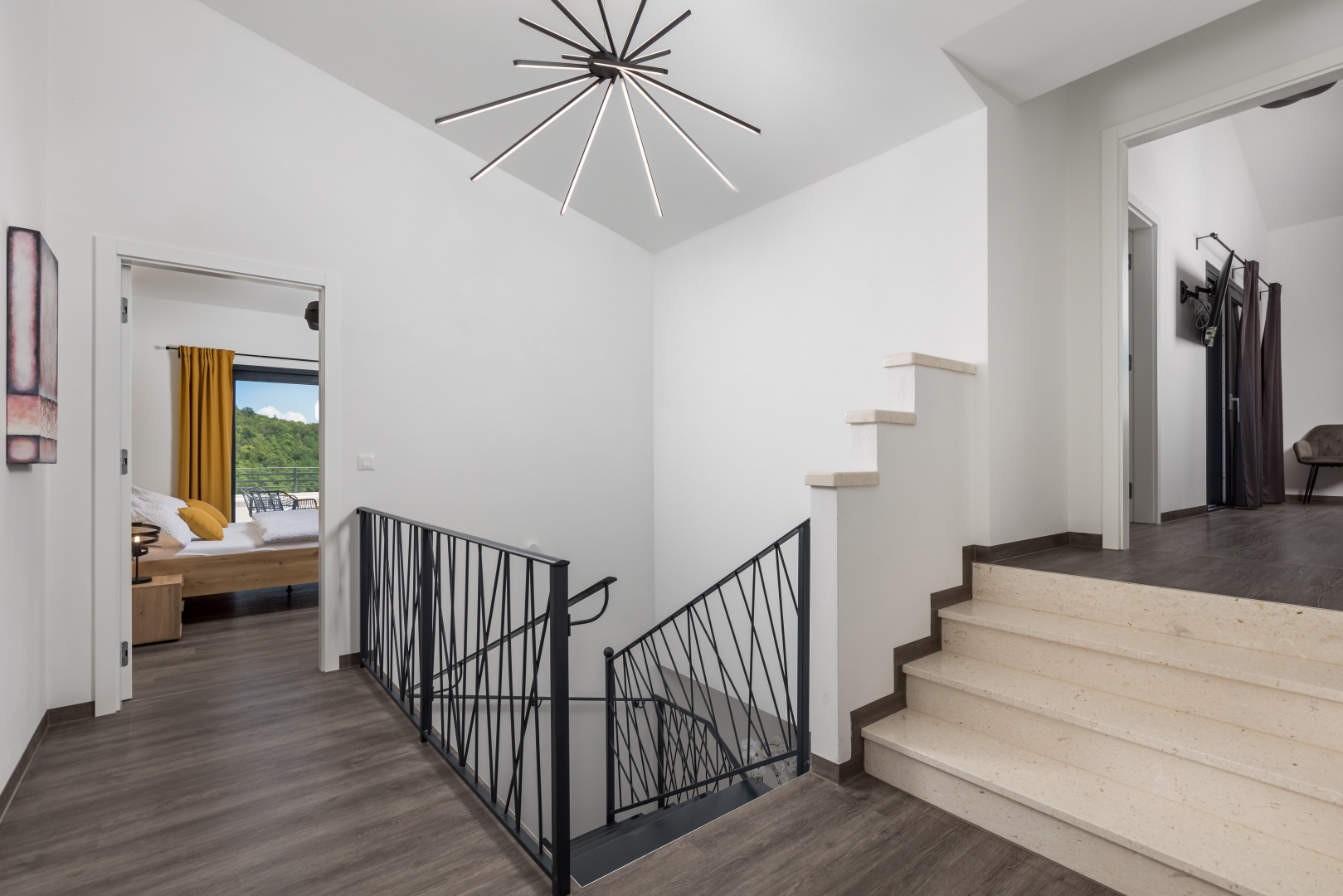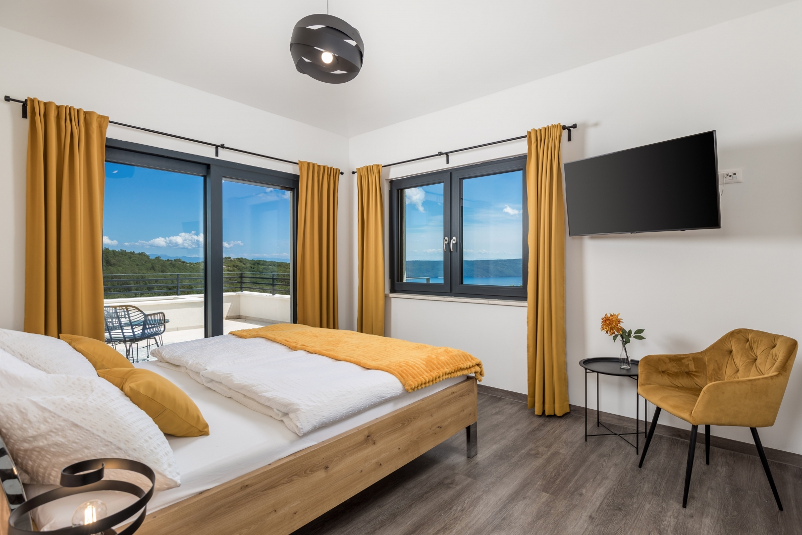 A felső emeleten három luxus hálószoba van saját gardróbbal és fürdőszobával. Kettőjük a tetőteraszra nyílik, ahonnan akadálytalan panorámás kilátás nyílik.