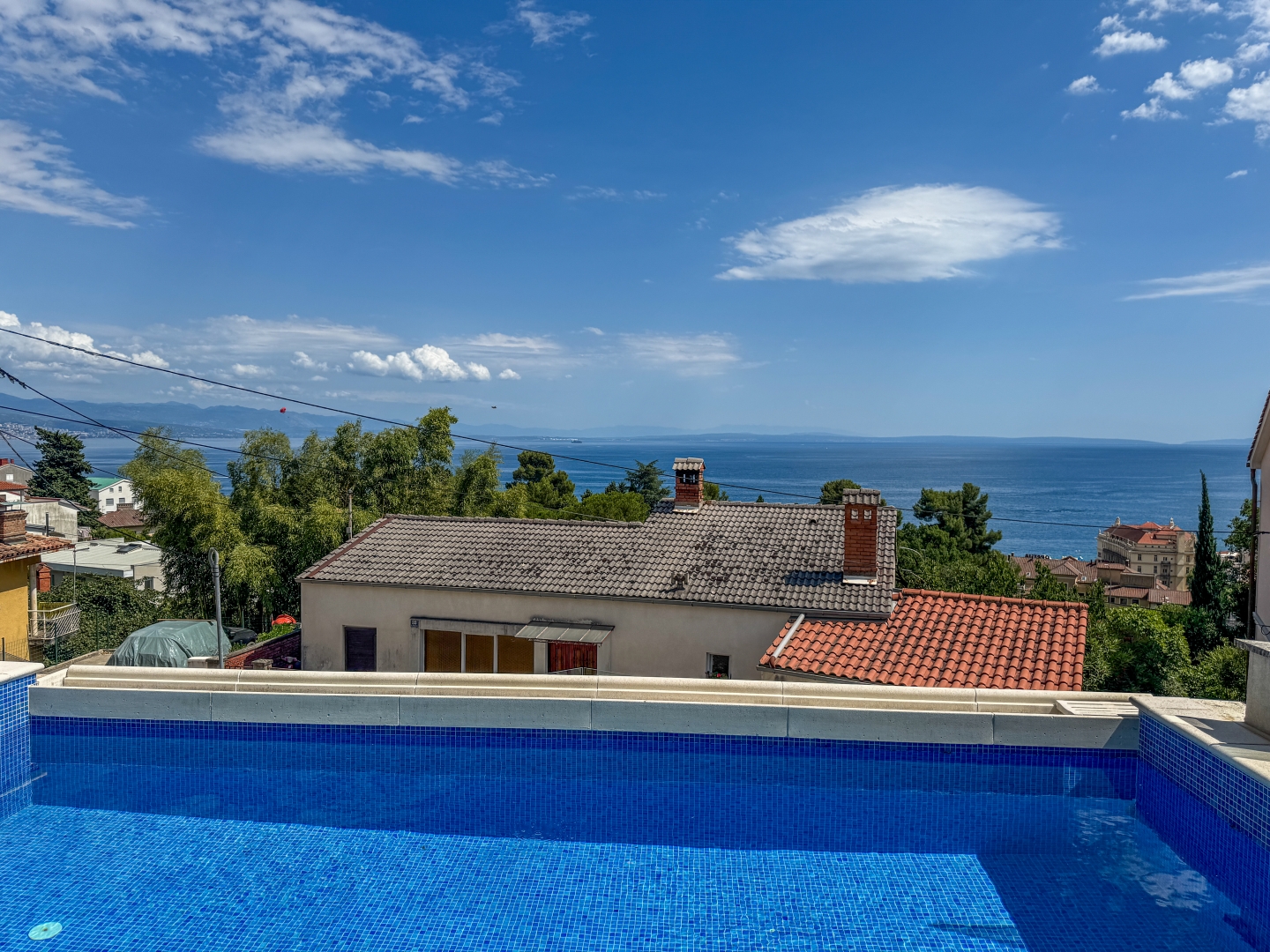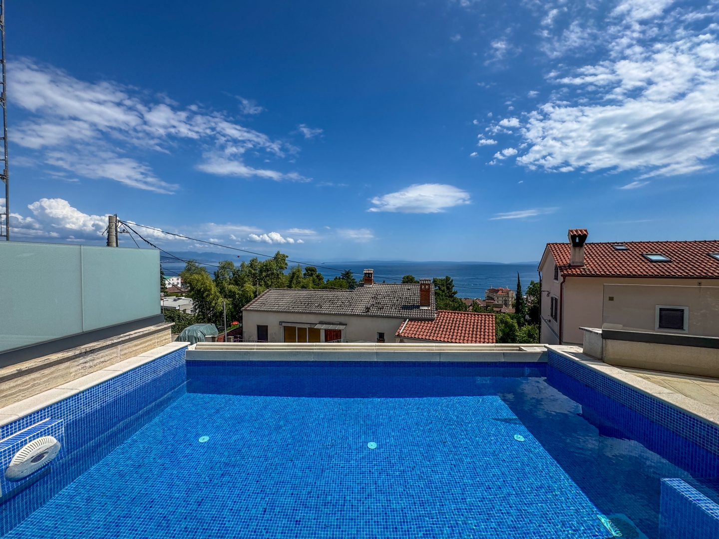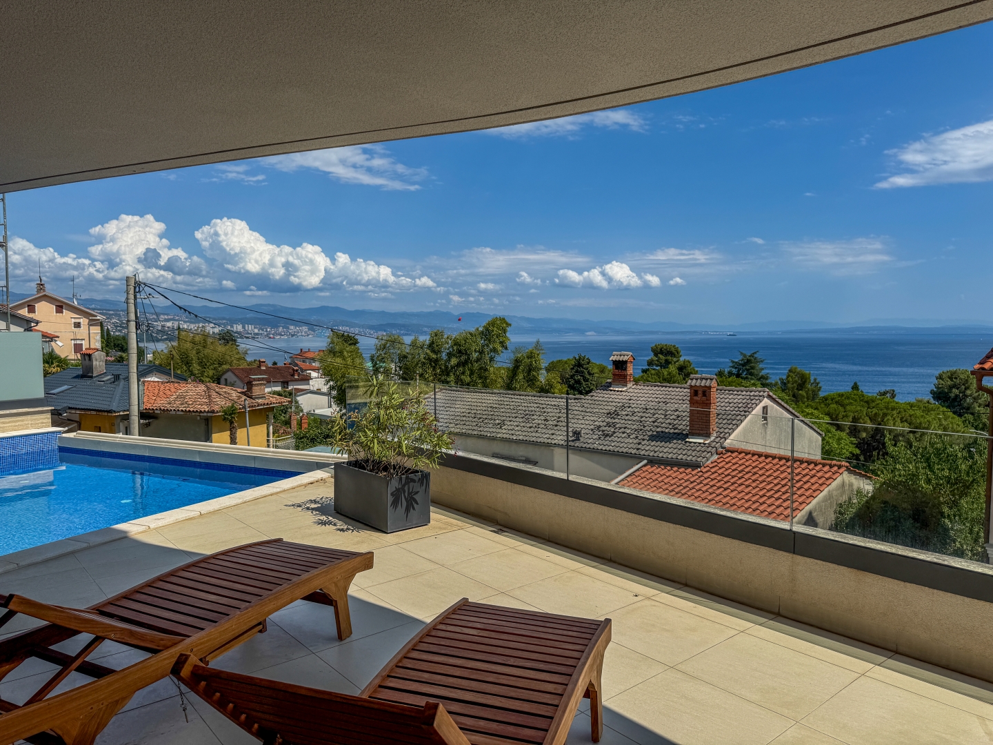 OPATIJA, KÖZPONT – modern apartman saját medencével, nagy terasszal és tengerre néző kilátással Abbázia központjában