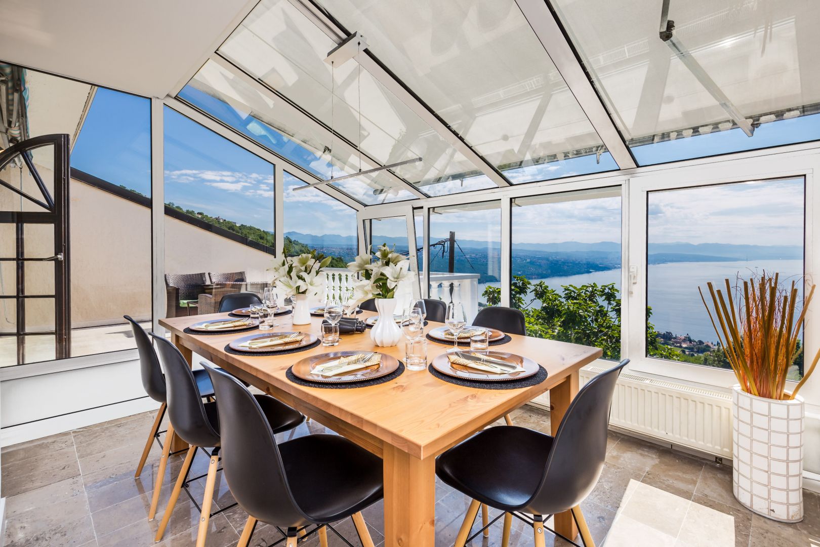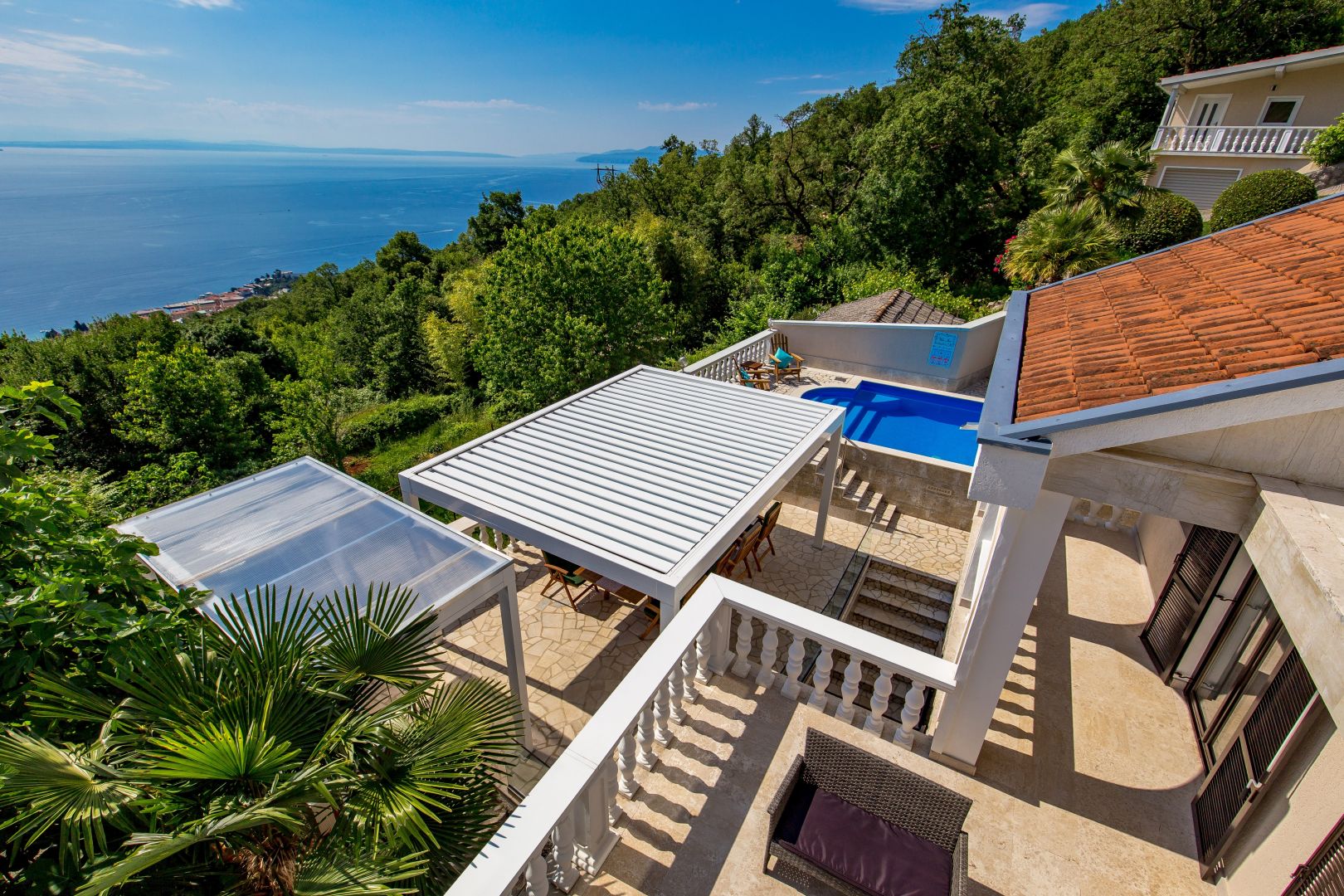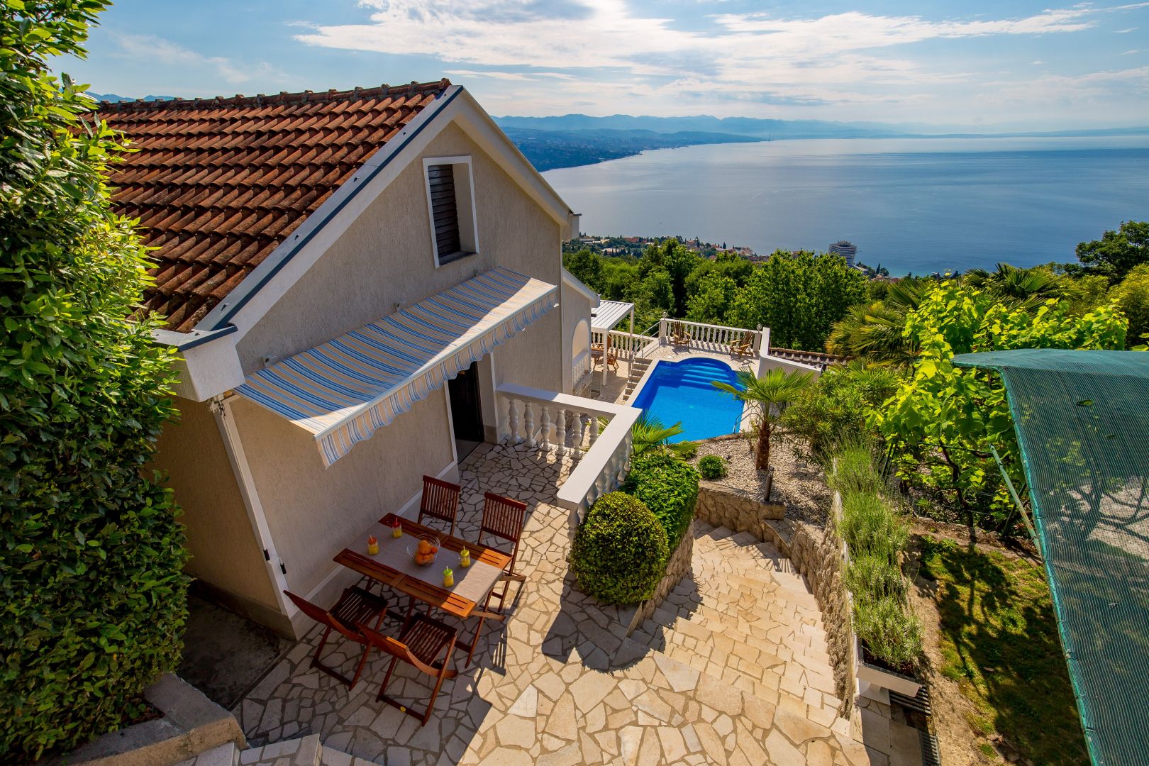 Ez a gyönyörű villa csendes helyen található, gyönyörű kilátással a Kvarner-öbölre. Abbázia közelében, parkosított és bekerített telken található. A teraszos villa teljes lakóterülete 430 m2, és egy 2000 m2-es teraszos telken található. 3 különálló lakóegységből áll, melyeket részben külső lépcső köt össze. A legnagyobb egység három emeleten terül el, amelyeket belső lépcsők kötnek össze. A számos terasz lehetővé teszi, hogy mindenki megtalálja a helyét. A tágas, 2000 m2-es kertben tengerre néző medence, különféle létesítmények, valamint parkolóhelyek találhatók. Megfelelő dokumentáció és tulajdonjog. Ideális ingatlan családi élethez vagy befektetésnek egy már bejáratott turisztikai bérbeadásba.