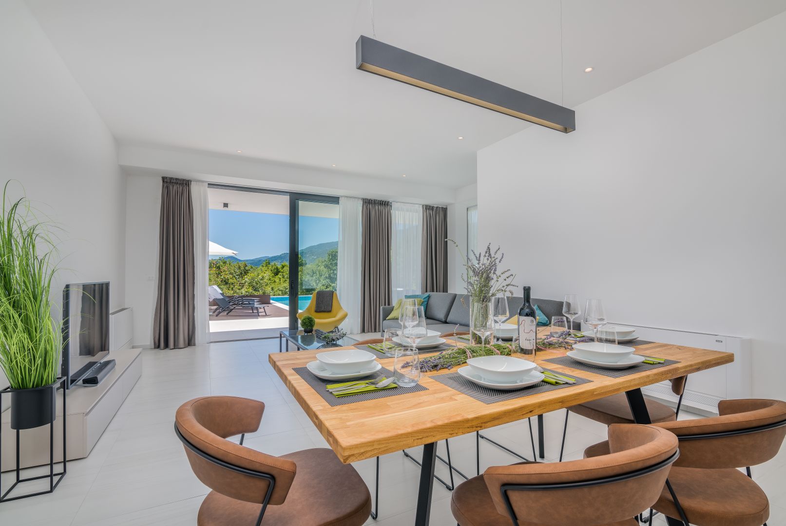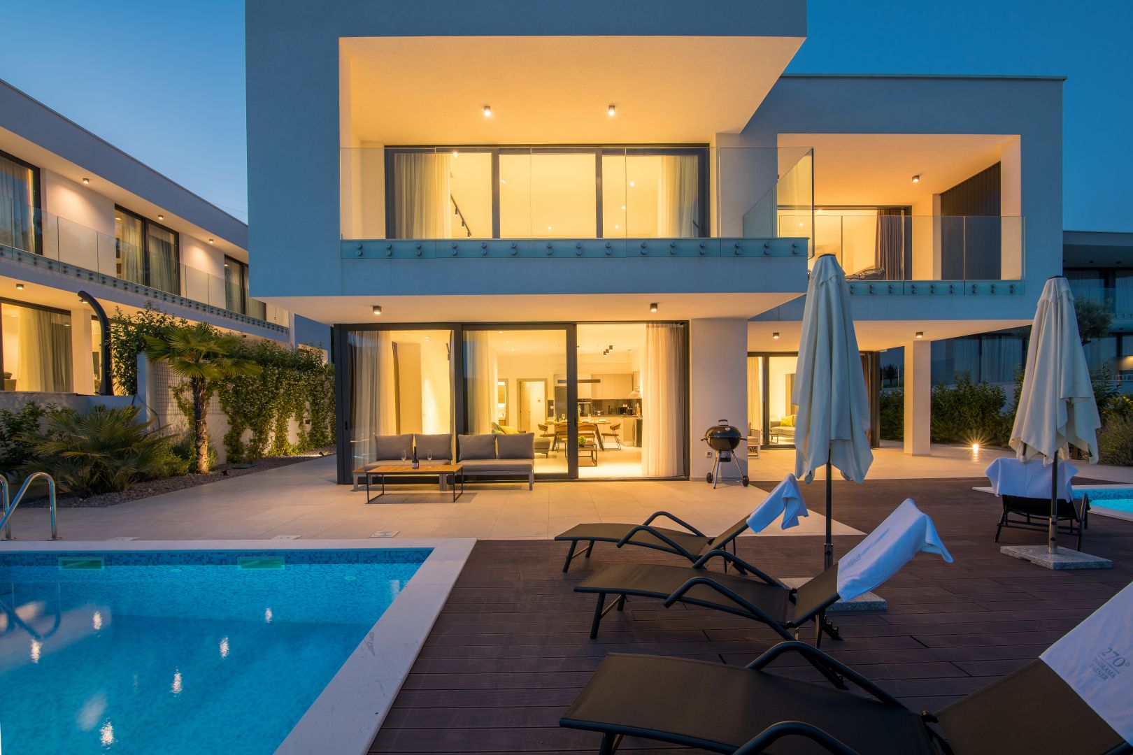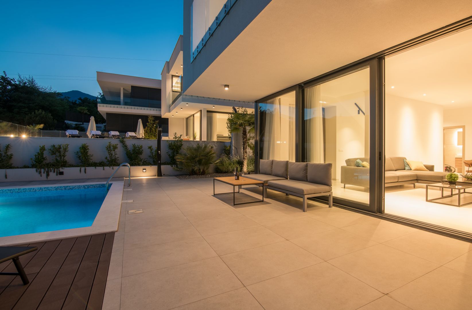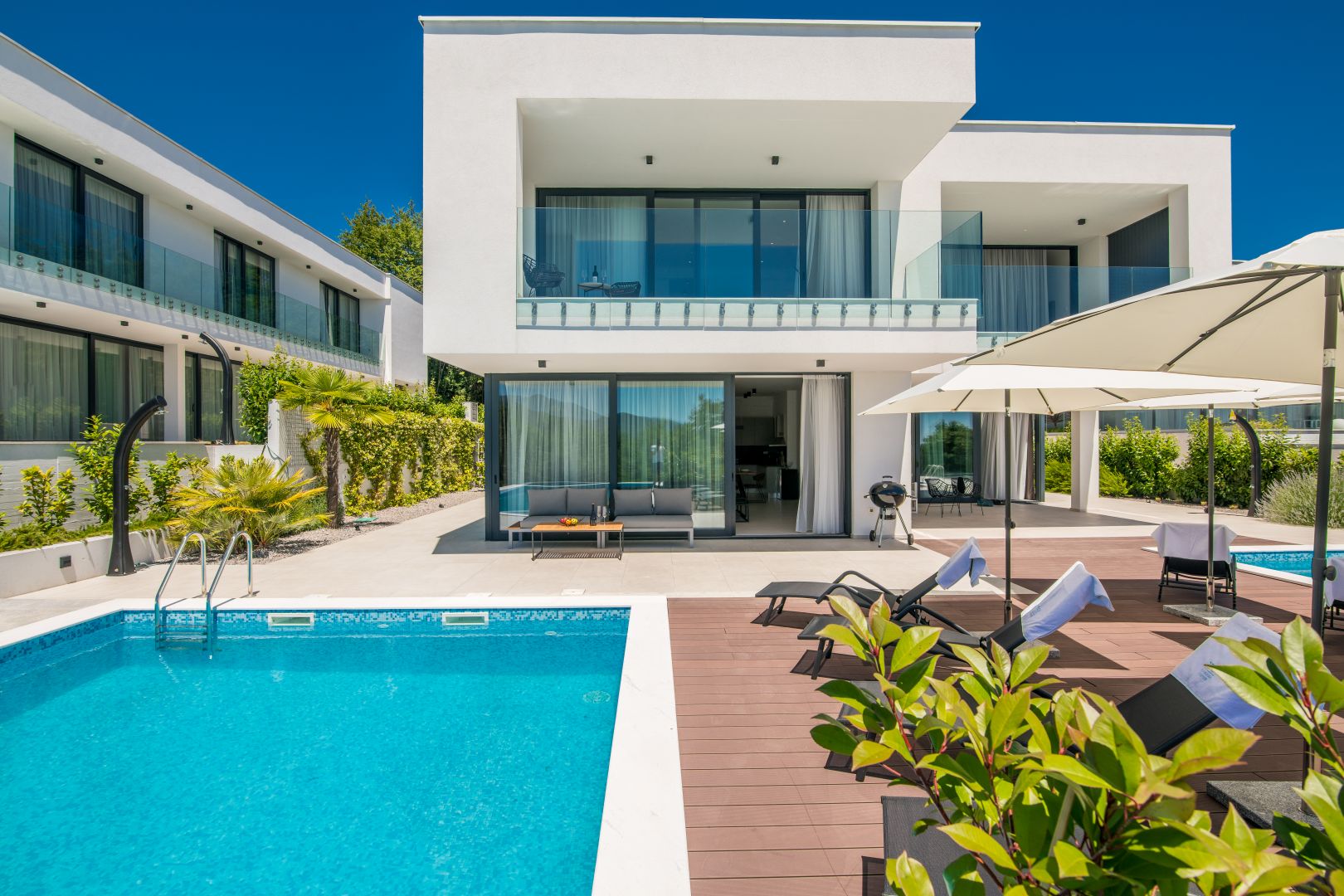 OPATIJA - Modern villa panorámás kilátással a tengerre. Különböző neveken ismertek, mint például; Az Öreg hölgy, az Adria gyöngye vagy a turizmus királynője, Abbázia egy elegáns tengerparti célpont, amelynek turisztikai hagyományai már 1844-ben kezdődtek. Abbáziát számos kisváros és falu veszi körül, amelyeket Voloskitól Lovranig a Lungomare parti sétány köt össze. Szabadidejét a számos kulturális rendezvény egyikén töltheti el. A nyári hónapokban Abbázia a kultúra és a művészet mekkájává válik, és olyan multimédiás, filmes, irodalmi, koncert- és színházi eseményeket kínál, amelyek Abbáziát a művészek és a közönség közötti határok nélküli színpaddá varázsolják. Adja meg magát a tenger varázsának, és élvezze a nappali szórakozást bárokban, karaokét és gasztronómiai ínyencségeket kínáló helyet, este pedig felébred a város, és mindenki ízlésének megfelelő gazdag éjszakai életet élvezhet. A Dux ingatlaniroda a varázslatos Abbázia szomszédságában kínálja ezt az új ikerház villát lélegzetelállító kilátással. A Kvarner-öböl egyik legszebb kilátásával, egy öbölben található, viharoktól védett, minőségi építésű és kiváló helyen felszerelt ház felejthetetlen tartózkodást kínál. A villa minden kényelmét megtapasztalhatja 269 m2-es lakóterében, amely az alagsoron, a földszinten és az emeleten keresztül húzódik. Így a földszinten a "nyílt tér" rendszer szerint kialakított nyitott tér található. Itt lehetősége nyílik eltölteni az idejét egy gyönyörűen berendezett nappaliban, amelyet az üvegfalak segítségével áraszt el a napfény. A luxus és teljesen felszerelt konyhában elkészítheti kedvenc finomságait. A természetes fényt a nagy üvegfalak biztosítják, amelyek kényelmesebbé teszik a tartózkodást, és tágasabbá teszik a szobát. A fent említett üvegfal kiváló kommunikációt biztosít a földszint és a villa külseje között. Ezen kívül a földszinten van egy hálószoba saját fürdőszobával és egy vendég WC. A gyönyörű villa alagsorában található egy fitneszterem (71 m2), egy kazánház (10 m2), egy medence motorház (10 m2), egy tároló helyiség és egy garázs két autó számára. Belső lépcső vezet a villa felső szintjére, ahol van egy további nappali erkéllyel, ahonnan gyönyörű kilátás nyílik a tengerre, valamint két kényelmes hálószoba saját fürdőszobával. A dizájner villa teljes történetét egy 550 m2-es parkosított kert zárja le, egyedülálló 70 m2-es úszómedencével és napozóterasszal. Ezen kívül van még két szabadtéri parkolóhely a villa mellett. A ház klímákkal és fűtési-hűtési rendszerrel felszerelt, padlófűtés - hőszivattyúk vannak beépítve. A dekoráció során kizárólag minőségi anyagokat használtak fel, ami egyben luxusingatlan státuszt is ad a villának. A tengertől való légtávolság mindössze 1500 méter, az első strandhoz vezető út pedig körülbelül 3 km. A vevő ingatlan forgalmi adót nem fizet, mert az ár tartalmazza az ÁFA-t. Ideális ház azoknak, akik bérelni szeretnének, de akár luxus családi otthonnak is. Az ügynökségi jutalék az Általános Szerződési Feltételek szerint kerül felszámításra: http://Ingatlan adatok