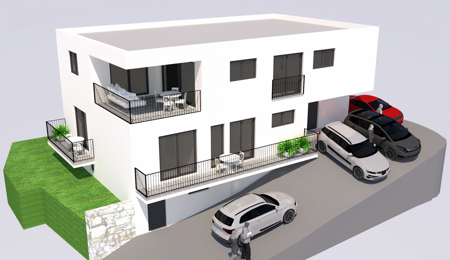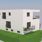 RAB SZIGET, BANJOL – Apartman 1 hálószobával + nappalival egy modern, új épületben Ez az új épület Banjol csendes és magaslati részén található, és gyönyörű kilátást nyújt a tengerre és az óváros központjára. És nem csak a felismerhető harangtornyokig, hanem a Barbat-csatornáig egészen Pagig. Az épület három lakásból áll, mindegyik külön bejárattal és két parkolóhellyel. ➡️Apartman 1: Földszint – ELÉRHETŐ – 1 hálószoba + nappali, külön bejárat, erkély, 2 parkolóhely, tengerre néző — 1 hálószobás apartman, nappali terület 42,99 m2, amely egy előtérből áll – gardrób, fürdőszoba, nyitott terű nappali konyhával, étkező és nappali és hálószoba 12,42 m2.