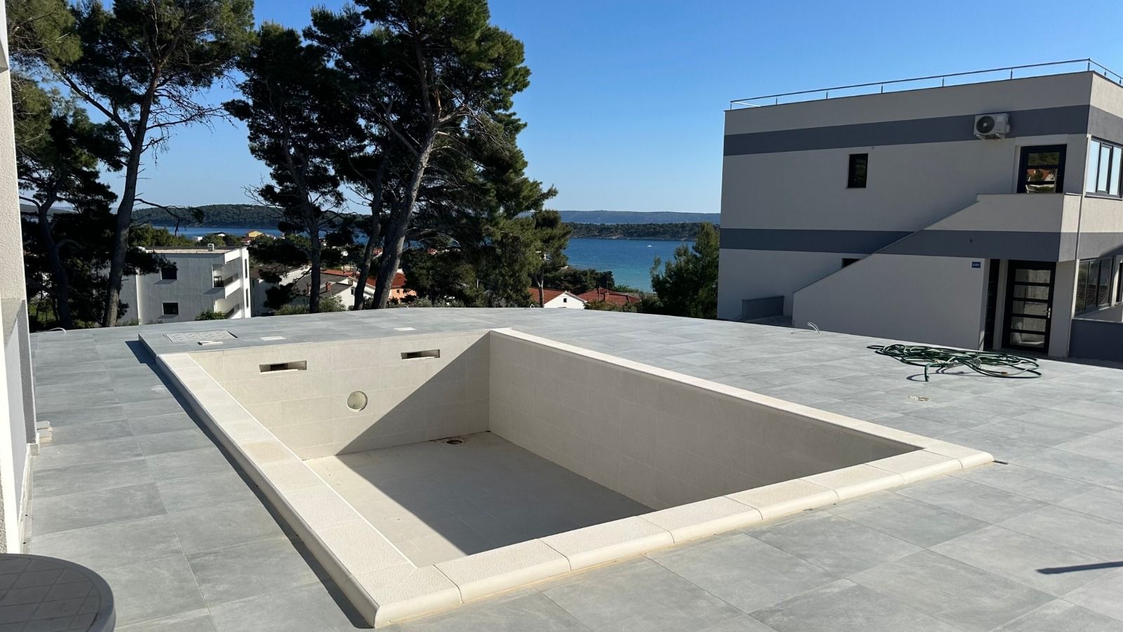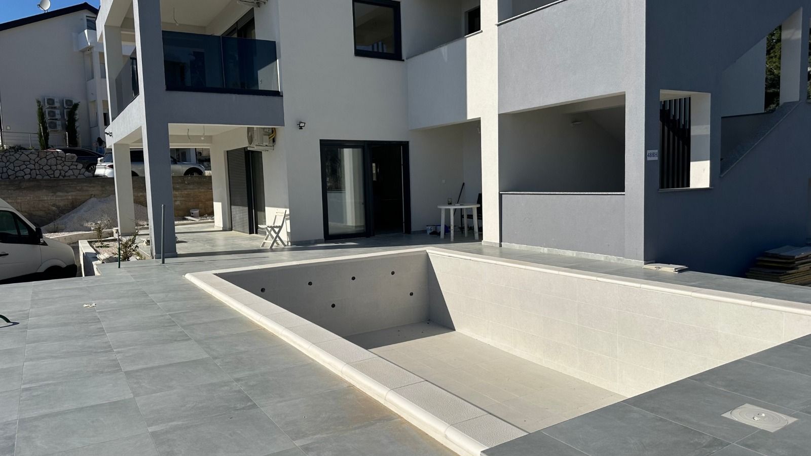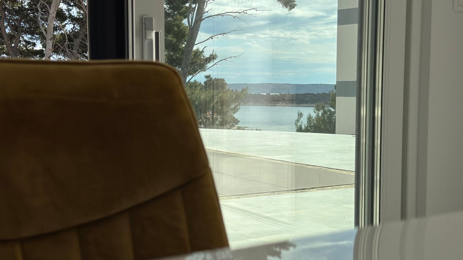 RAB SZIGETE, BANJOL - Exkluzív földszinti apartman úszómedencével Bemutatunk Önnek egy luxuslakást egy modern városi villa földszintjén, csendes és magaslati helyen, amely békét és magánéletet kínál, lenyűgöző kilátással a tengerre. Mindössze 300 méterre a tengertől és a gyönyörű strandoktól, egy zsákutcában. 133 m²-es, kiváló kialakítású és kényelmes lakás - a földszinti lakás három hálószobából, két modern fürdőszobából, egy tágas nappaliból, konyhából és étkezőből áll - ideális hely az összejövetelekhez, a szórakozáshoz és az emlékek megalkotásához. A tér nagy üvegfalakon keresztül kapcsolódik egy tengerre néző kültéri teraszhoz.