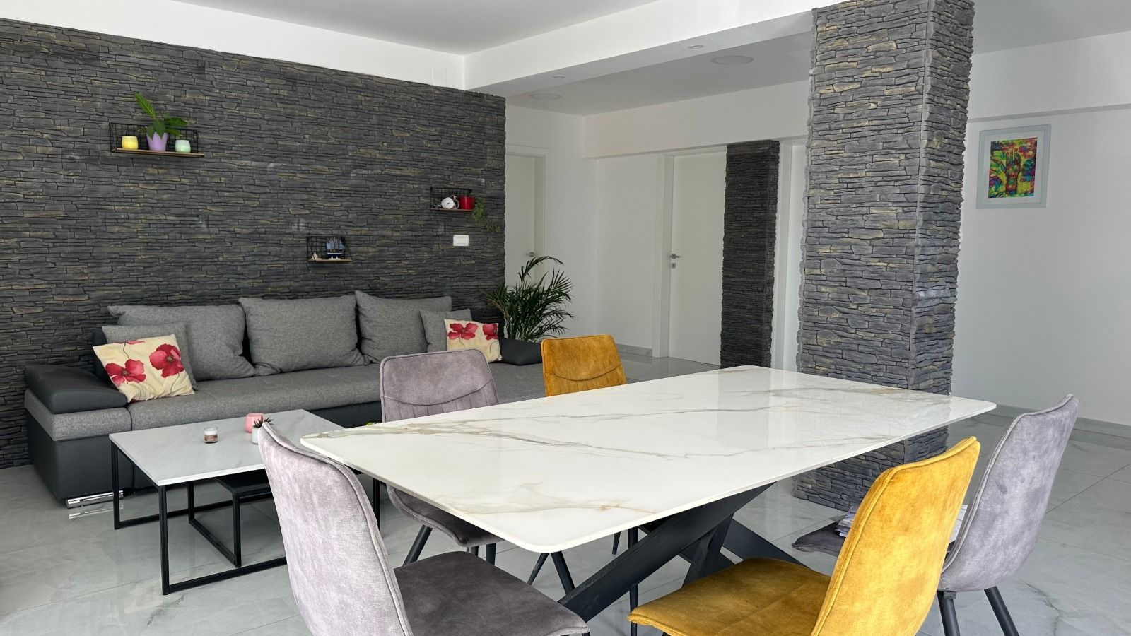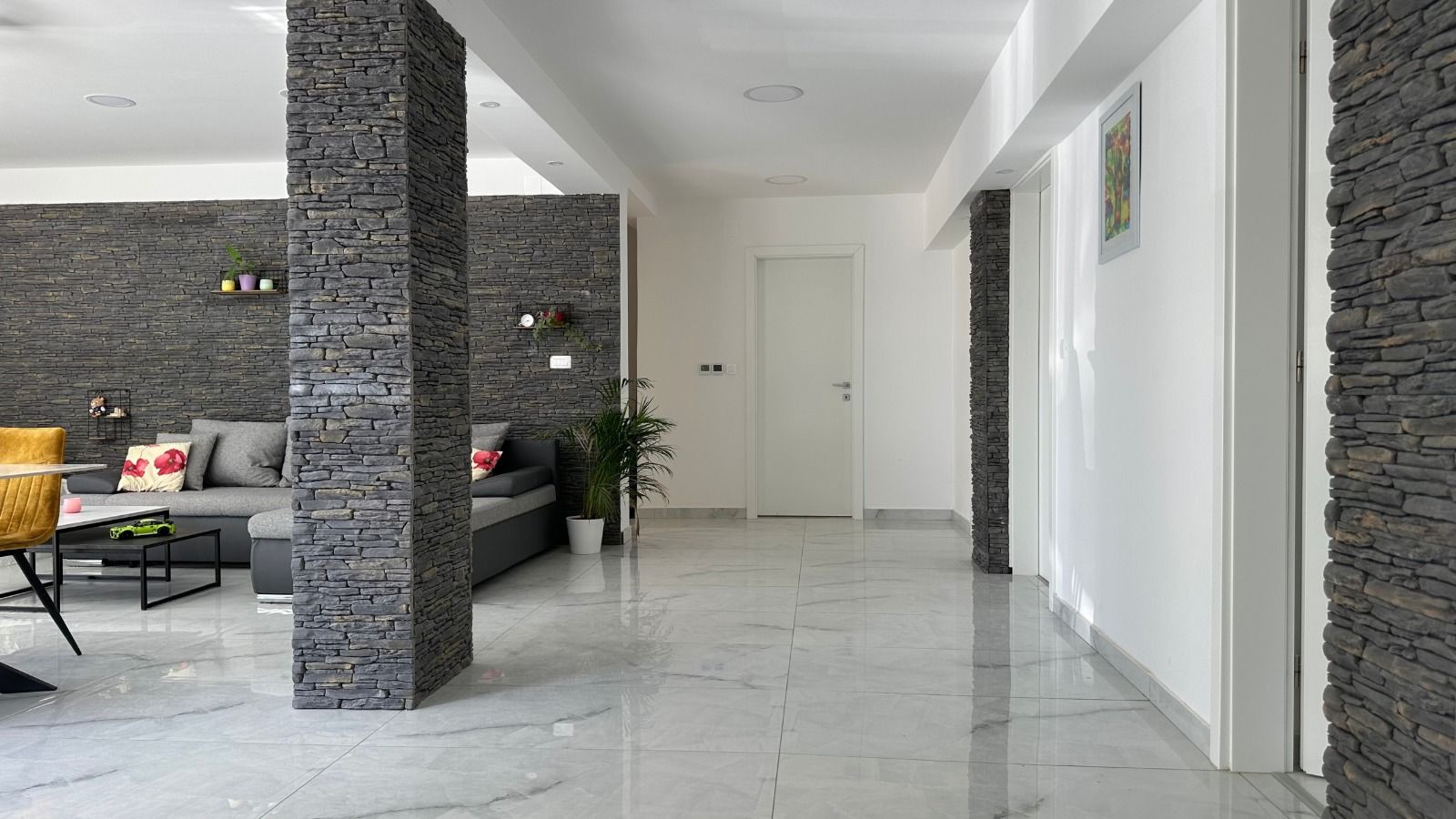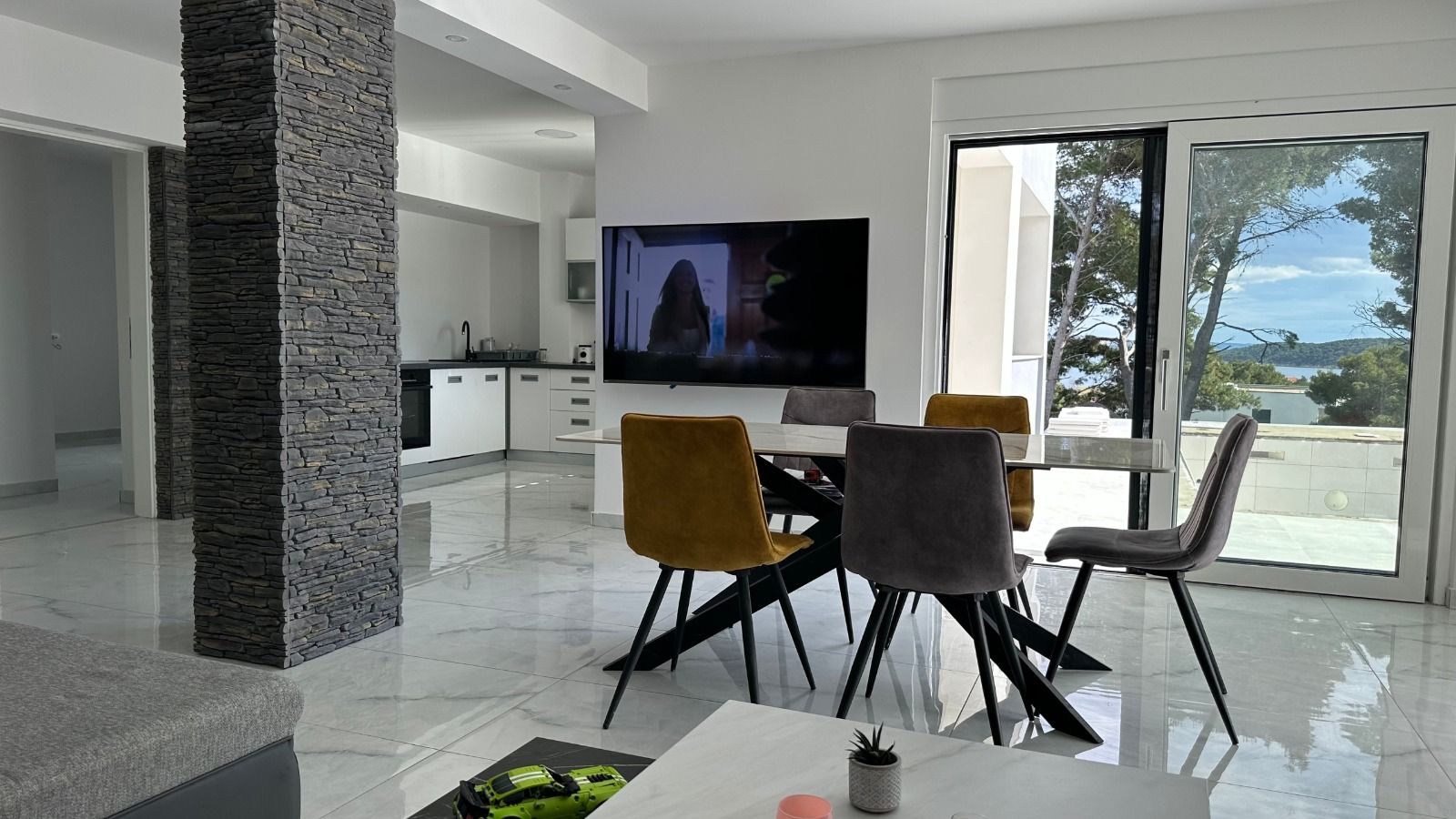 RAB SZIGETE, BANJOL - Exkluzív földszinti apartman úszómedencével Bemutatunk Önnek egy luxuslakást egy modern városi villa földszintjén, csendes és magaslati helyen, amely békét és magánéletet kínál, lenyűgöző kilátással a tengerre. Mindössze 300 méterre a tengertől és a gyönyörű strandoktól, egy zsákutcában. 133 m²-es, kiváló kialakítású és kényelmes lakás - a földszinti lakás három hálószobából, két modern fürdőszobából, egy tágas nappaliból, konyhából és étkezőből áll - ideális hely az összejövetelekhez, a szórakozáshoz és az emlékek megalkotásához. A tér nagy üvegfalakon keresztül kapcsolódik egy tengerre néző kültéri teraszhoz.