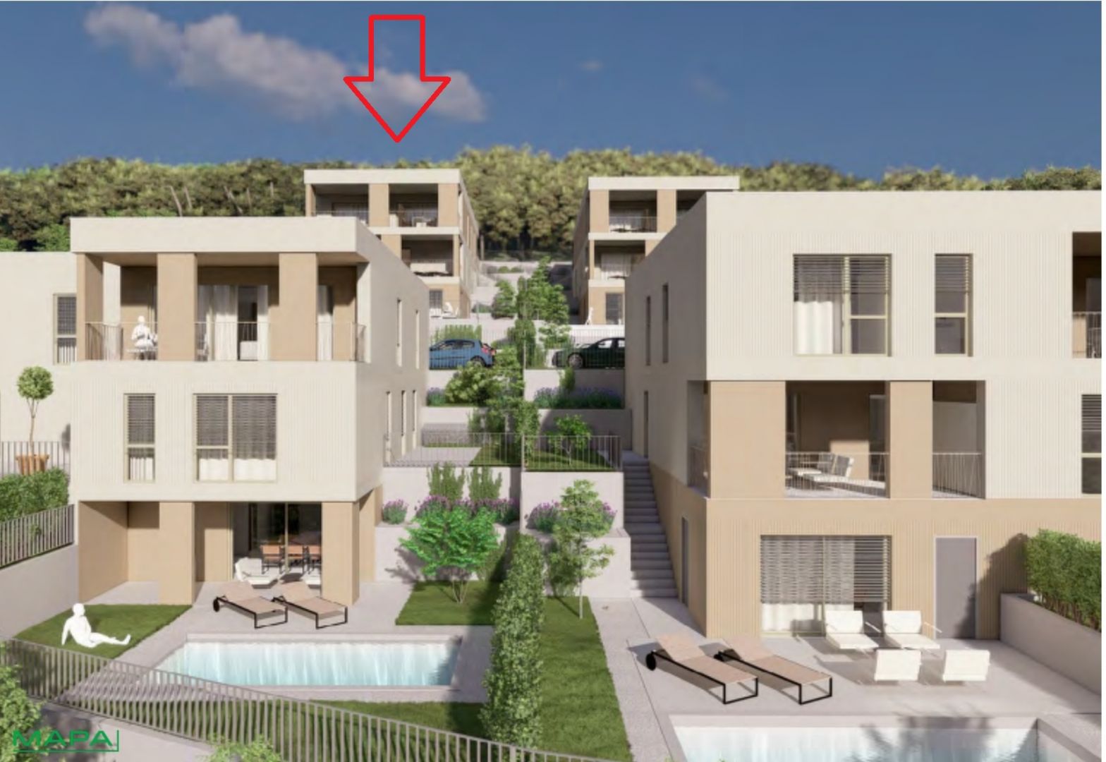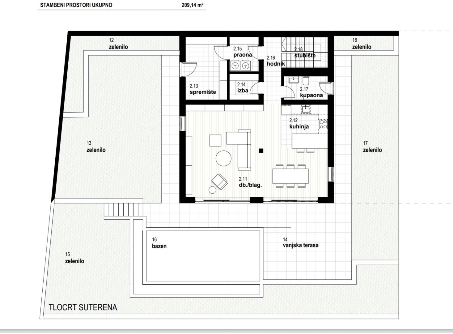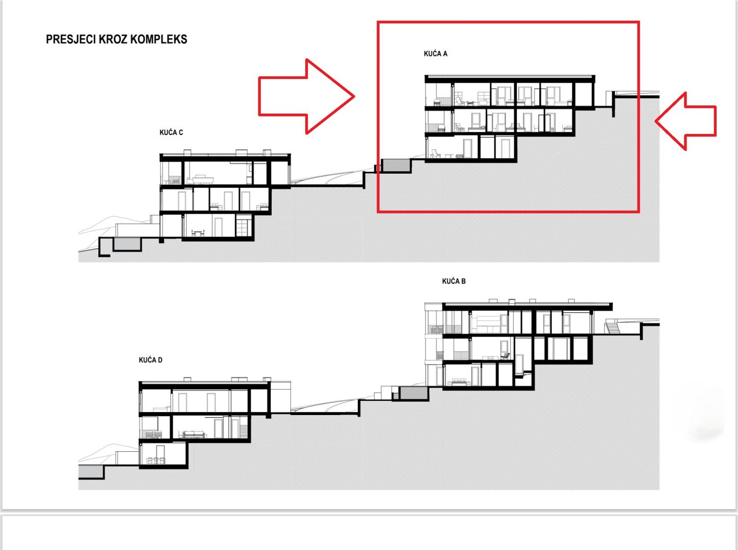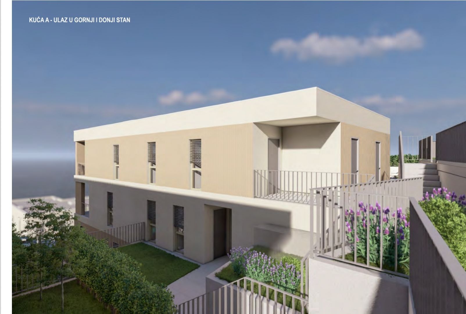 RIJEKA, KOSTRENA – exkluzív kétszintes lakás 209,14m2, új épület, gyönyörű kilátással a tengerre és medence + kert 356,39 m2 – S2-A Modern dizájnt és eleganciát, kényelmet és csúcsminőségű felszereltséget kínáló ingatlant kínálunk, gyönyörű, csendes helyen, tömegközlekedés, iskolák, óvodák, bevásárlóközpontok közelében, Rijekától tíz perces autóútra. A 4 lakóépületből álló, összesen 8 apartmanból álló komplexum az Adriai autópályától északra, a „Zelena Kostrena” területén található, ahonnan gyönyörű kilátás nyílik az egész Kvarner-öbölre. A közvetlen közelben 10 kilométernyi jól karbantartott túra-, kerékpár- és fitneszútvonal halad át Kostrena legmagasabb pontjain a Solin-csúcstól a Sopalj-csúcsig. A házak megközelítése a felső útról megoldott, ahol a meglévő út javítását, bővítését tervezik.