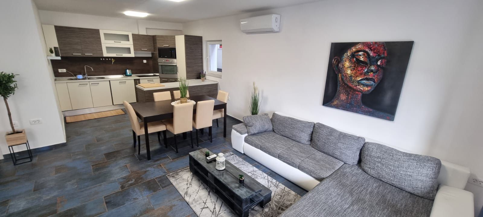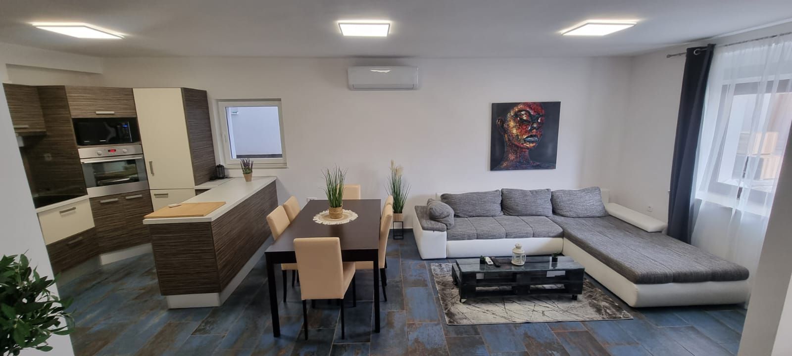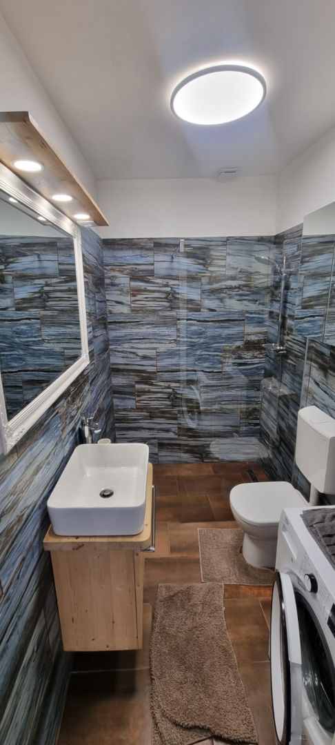 1263 m2-en 2 ház, 2 különálló melléképület található, melyekben minden épületben egy lakás található + mindegyik saját terasszal, 2 előtető (lugas), mely alatt asztalok és kültéri fotelek találhatók, porfírkővel burkolt nagy udvar, a pázsit mellett egy kocsma. – 5 db lakóegység. 2021-ben teljesen felújított mind a 4 épület (új tető, új ereszcsatornák, új homlokzat – 10 cm polisztirol, új vízvezetékek, új villanyszerelés, új előtetők készültek, porfír kővel burkolt udvar…). – Az első ház 2 külön bejáratú apartmanból + pavilonból áll (97 m2 emeletenként + pavilon 29 m2). A földszinten található 2 hálószoba, nappali, konyha és fürdőszoba WC-vel. Az első emeleten 2 hálószoba, nappali, konyha, fürdőszoba WC-vel és egy nagy erkély található. – A második ház 1 lakás kétszintes + előtető (szintenként 54 m2 + 25 m2 előtető). A földszinten egy nagy nappali, konyha, fürdőszoba WC-vel és egy tárolóhelyiségként funkcionáló szoba található. Az emeleten 2 szoba, wc és galéria található. – Az első melléképületben 1 lakás található (34 m2). Található benne 1 hálószoba, nappali, konyha, fürdőszoba WC-vel és egy tárolóhelyiségként funkcionáló szoba + egy hozzá tartozó terasz. – A második melléképületben 1 lakás található (25 m2). Található benne 1 hálószoba nappalival, konyha és fürdőszoba WC-vel + terasz. – A harmadik épület a pázsit mellett található, és tavernaként szolgál grillezővel. Az ingatlan a földszintről a tengerre, az emeletről pedig a teljes Kvarner-öbölre néz. Kiváló infrastruktúra (busz, étterem, óvoda, kórház, gyógyszertár, benzinkút…). Ez az ingatlan kb. 290 méterre a tengertől légvonalban, vagy 6 perc autóval a Sablićevo strandig vagy kb. 12 perc sétára a Sablićevo strandtól. Jó lehetőség lakást/házat bérbe adó befektetőknek. Az ingatlan jelenleg teljesen ki van bérelve, és havonta 4450 euróval járul hozzá. A ház csendes, nyugodt környezetben található. EGYEDI INGATLAN NAGY ÉS EGYEDI HELYEN NAGY POTENCIÁVAL!!!