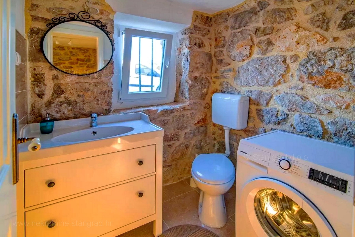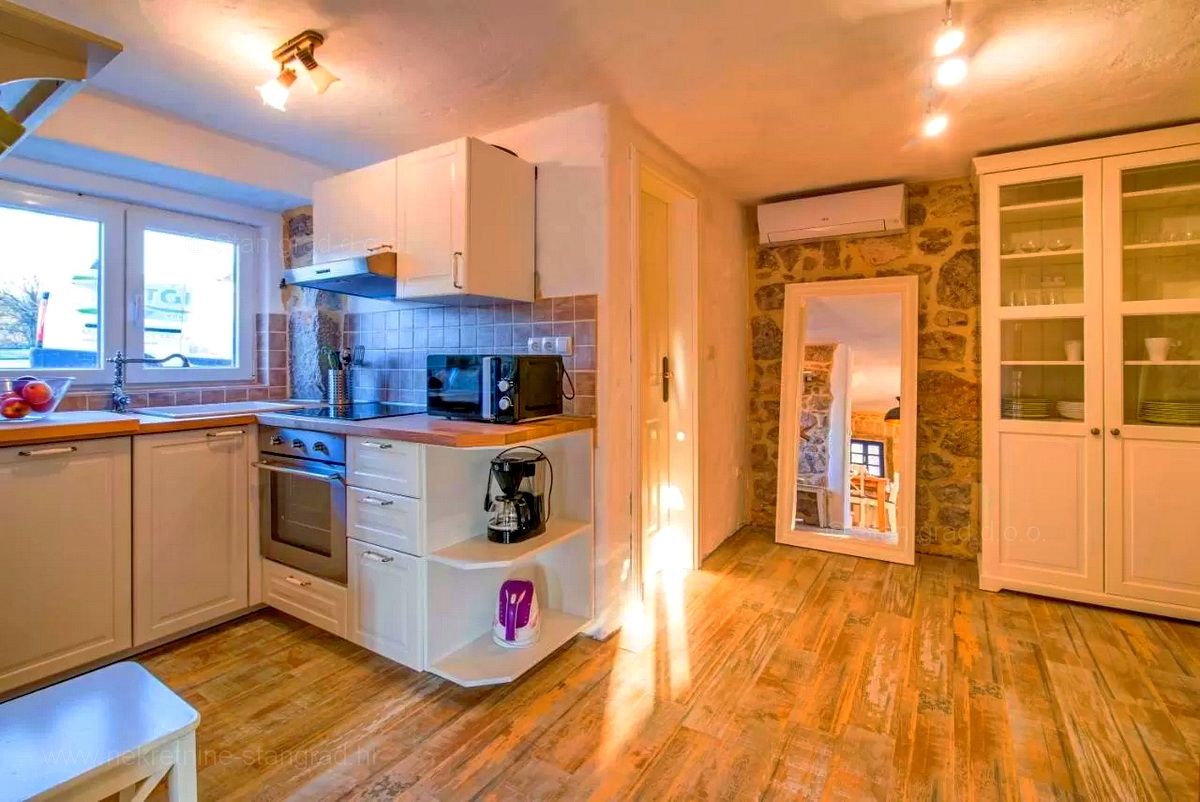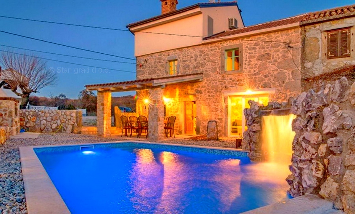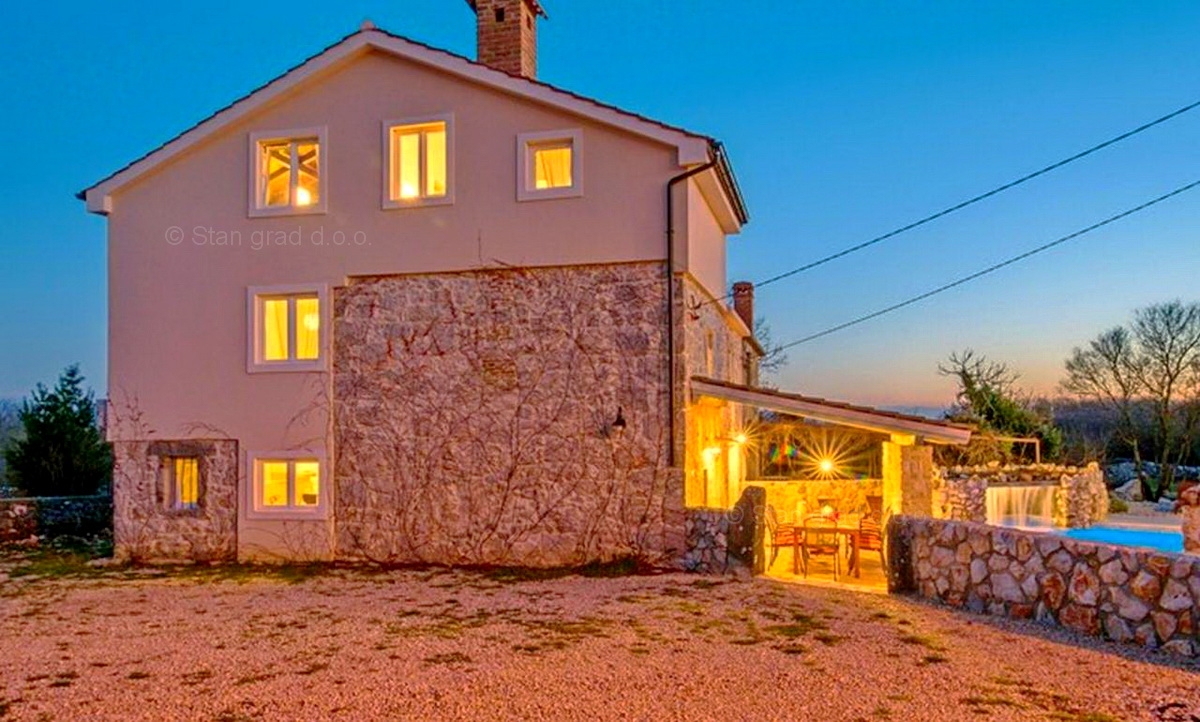 A Stan Grad Immobilien ügynökség jó ingatlan-kínálatából egy gyönyörű romantikus kőházat emeltek ki a Krk-sziget régiójában. Az ingatlan Vrbnik közelében található, olyan helyen, ahol élvezheti a természet zöldjét és a békét. Ez a gyönyörű, jó minőségű ház 2 emeleten épült. A földszint és az első emelet áll. A ház teljes területe 150 m2. Nagyon ízlésesen berendezett. Ezen a területen nappali és konyha, 3 hálószoba, 2 fürdőszoba, 1 WC és 1 fedett terasz található. Az ingatlanhoz gyönyörűen parkosított kert tartozik, ahol vízeséssel ellátott medence és napozóterasz található. Az ingatlan udvarán helyet kapott a járművek kényelmes parkolása. A fentieken kívül nem elhanyagolható azt mondani, hogy a ház gyönyörű kilátást nyújt a természetes növényzetre, a pihenés igazi béke oázisára. Ez az ingatlan természetes személy tulajdonában van. A ház eladója garantálja a teljes tulajdonosi dokumentumokat és az ingatlan megfelelő átruházását. A Stan Grad Immobilien irodai ügynökei segítenek a ház nyilvántartásában és minden más adminisztrációs feladatban.Ingatlan adatok